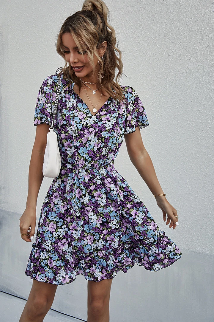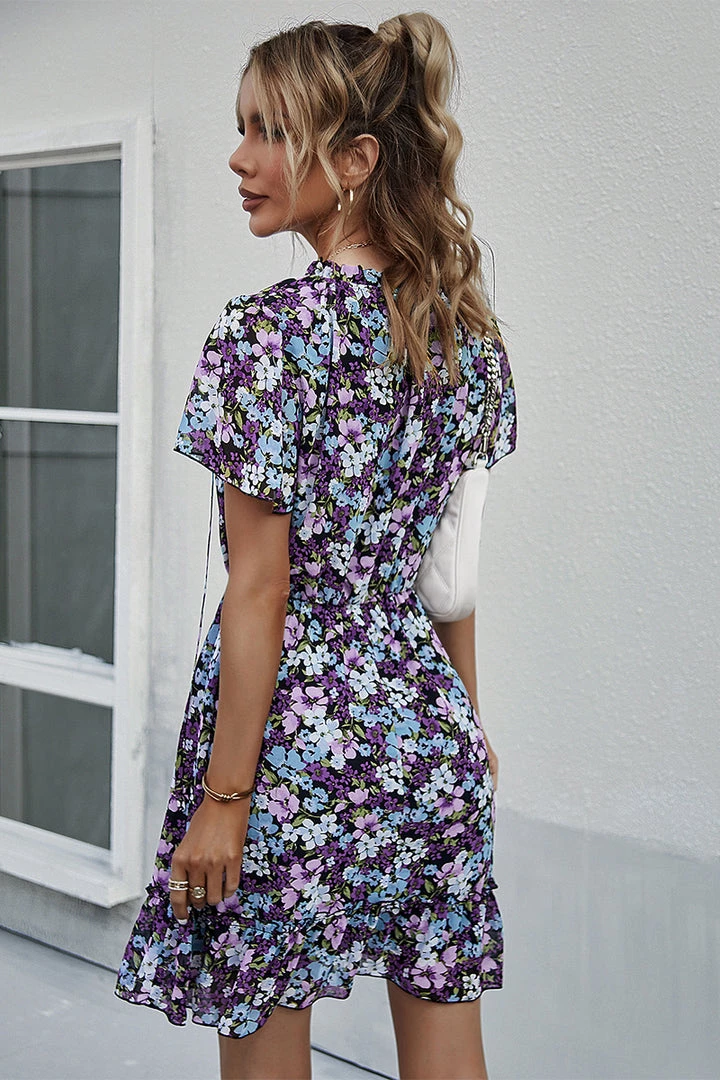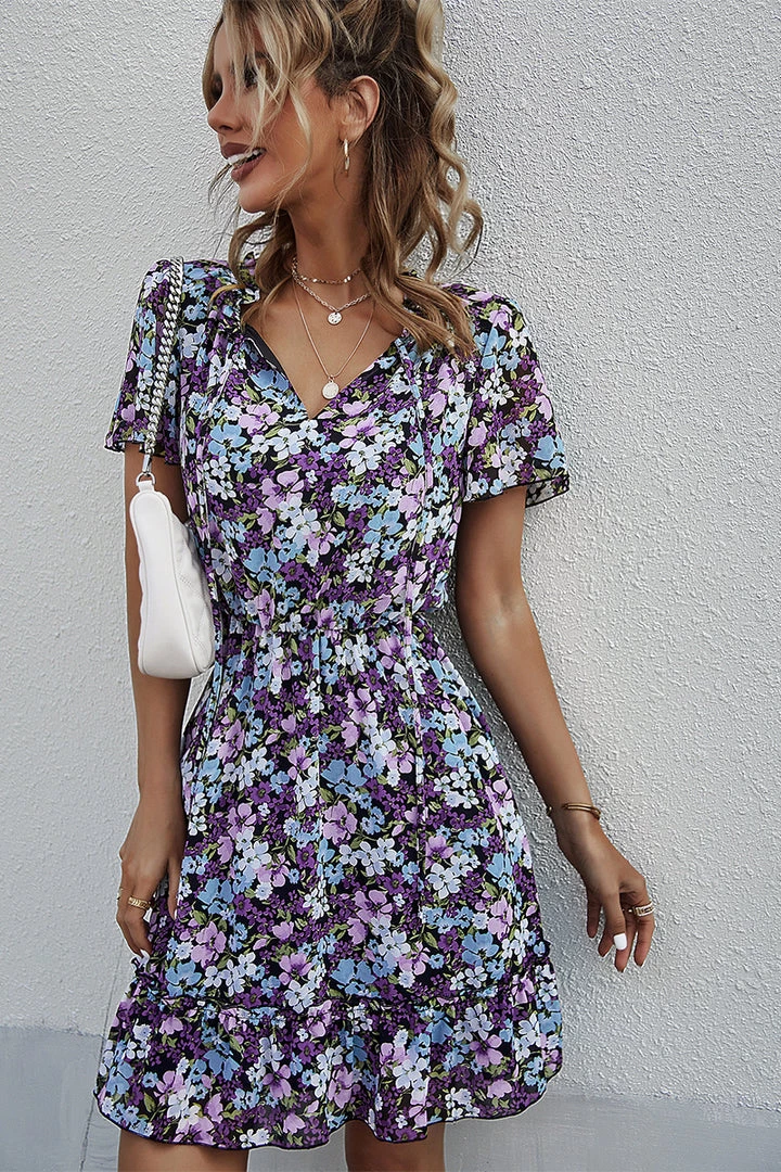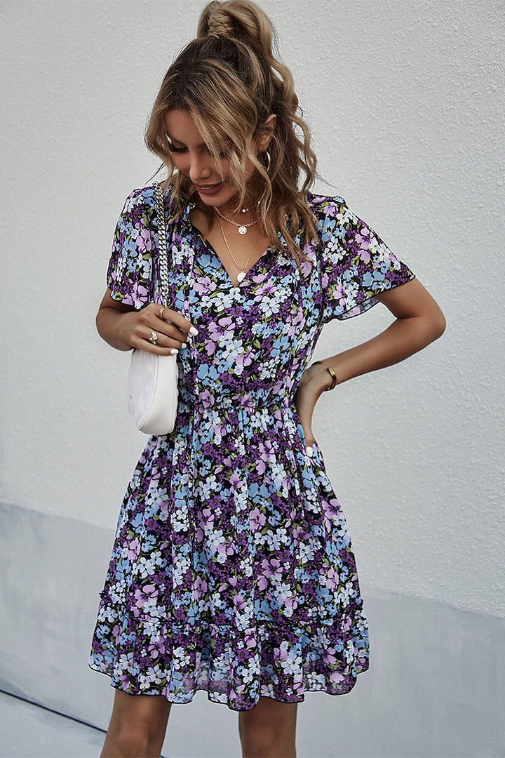 Our Luisa Dress is a vibrant purple, black, blue & green-toned floral print mini in a peasant-style dress that oozes fabness! The v collar has a tie detail featuring a tassel that adds texture to the dress.