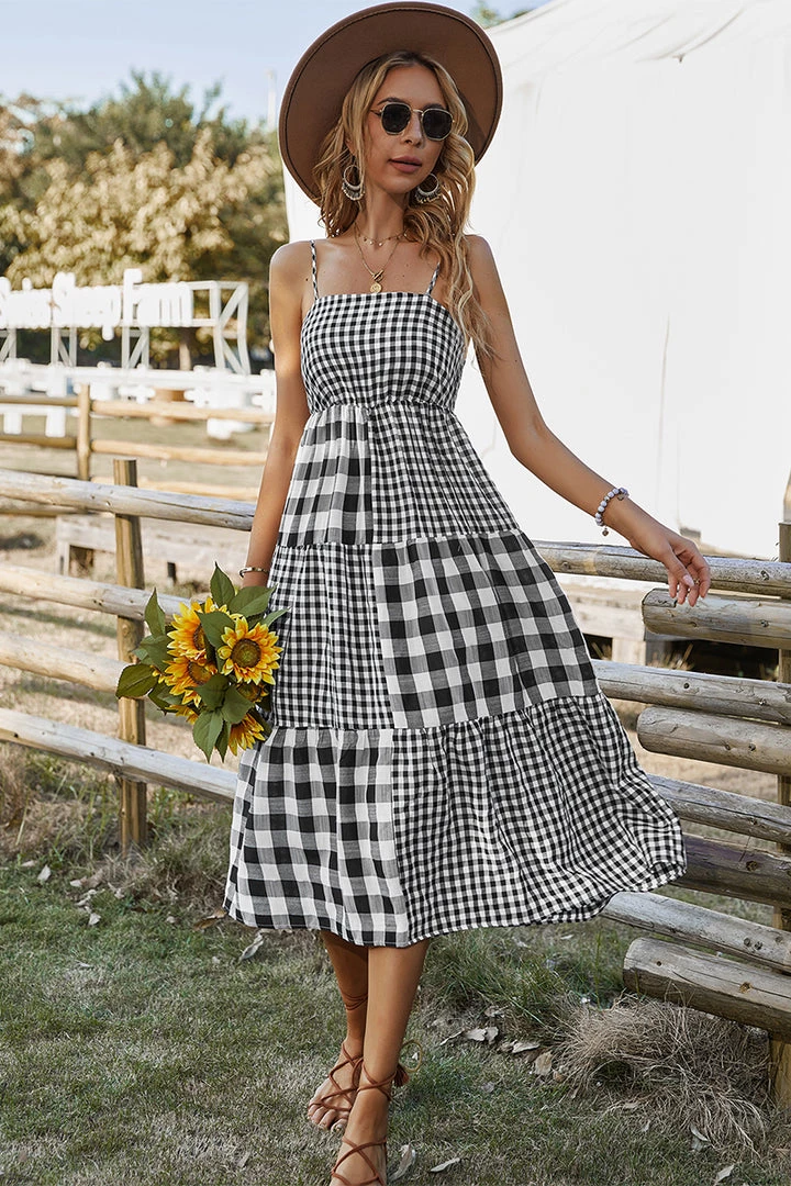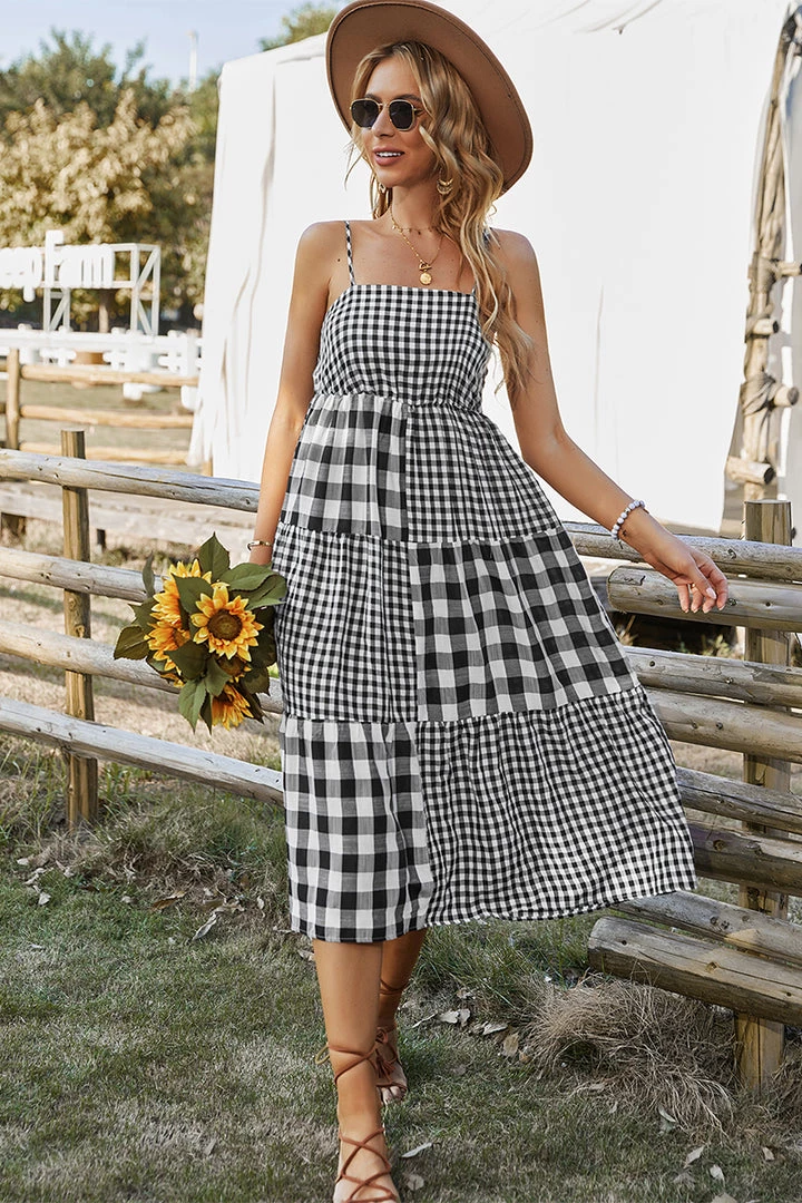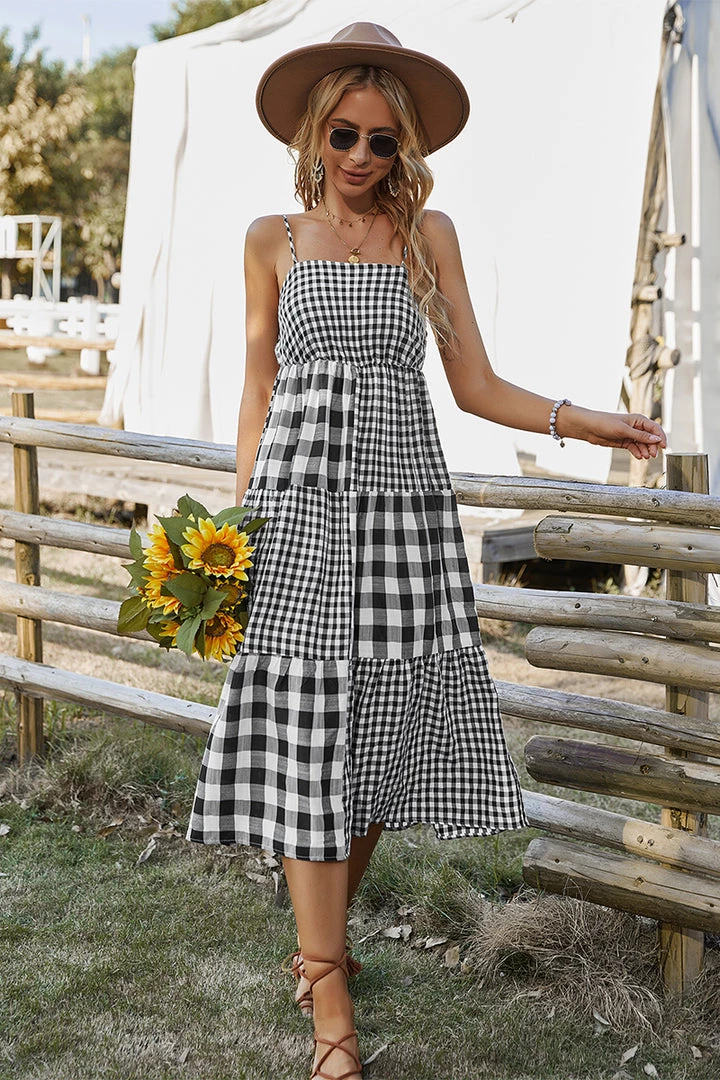 Our Margaretta Dress comes in a black and white checkered print. This features a singlet style, sleeveless with frill details, an elastic bodice, and a flowy skirt. The relaxed fit mid pairs beautifully with our heels or sandals for a fun casual look!