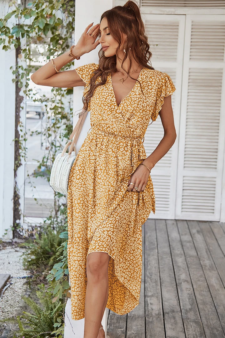 Our Marnie Dress comes in a mustard yellow tone base, with a white tone print. It features a v neckline, short sleeves, and a waist belt. This flowy midi pairs beautifully with our heels or sandals for a summer casual look!