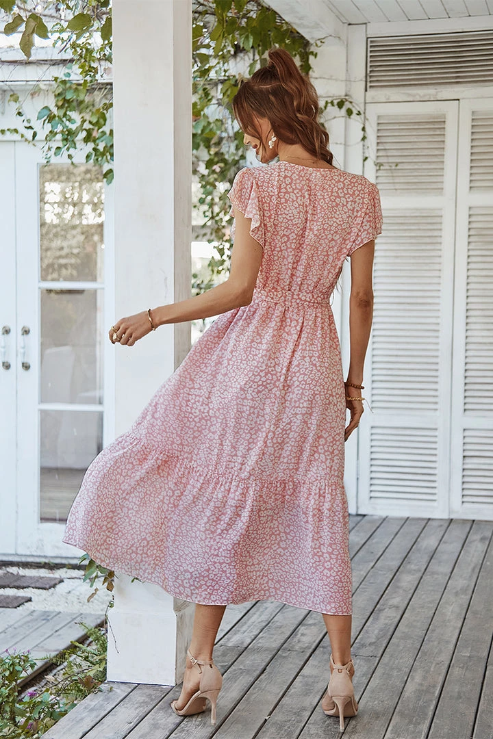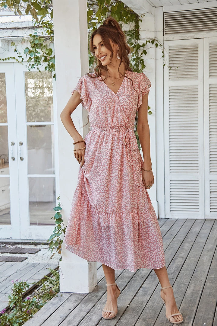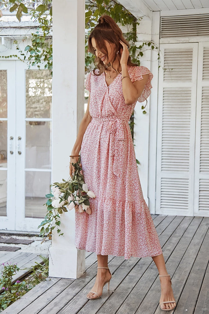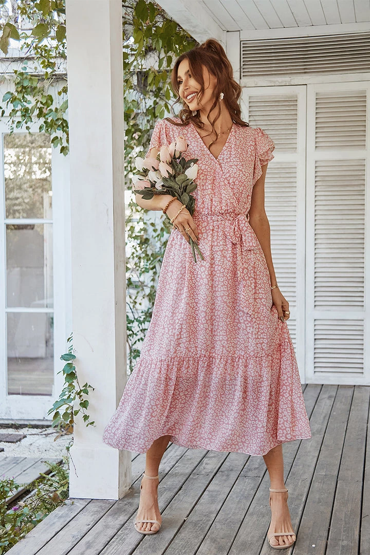 Our Marnie Dress comes in a blush pink tone base, with a white tone print. It features a v neckline, short sleeves, and a waist belt. This flowy midi pairs beautifully with our heels or sandals for a summer casual look!