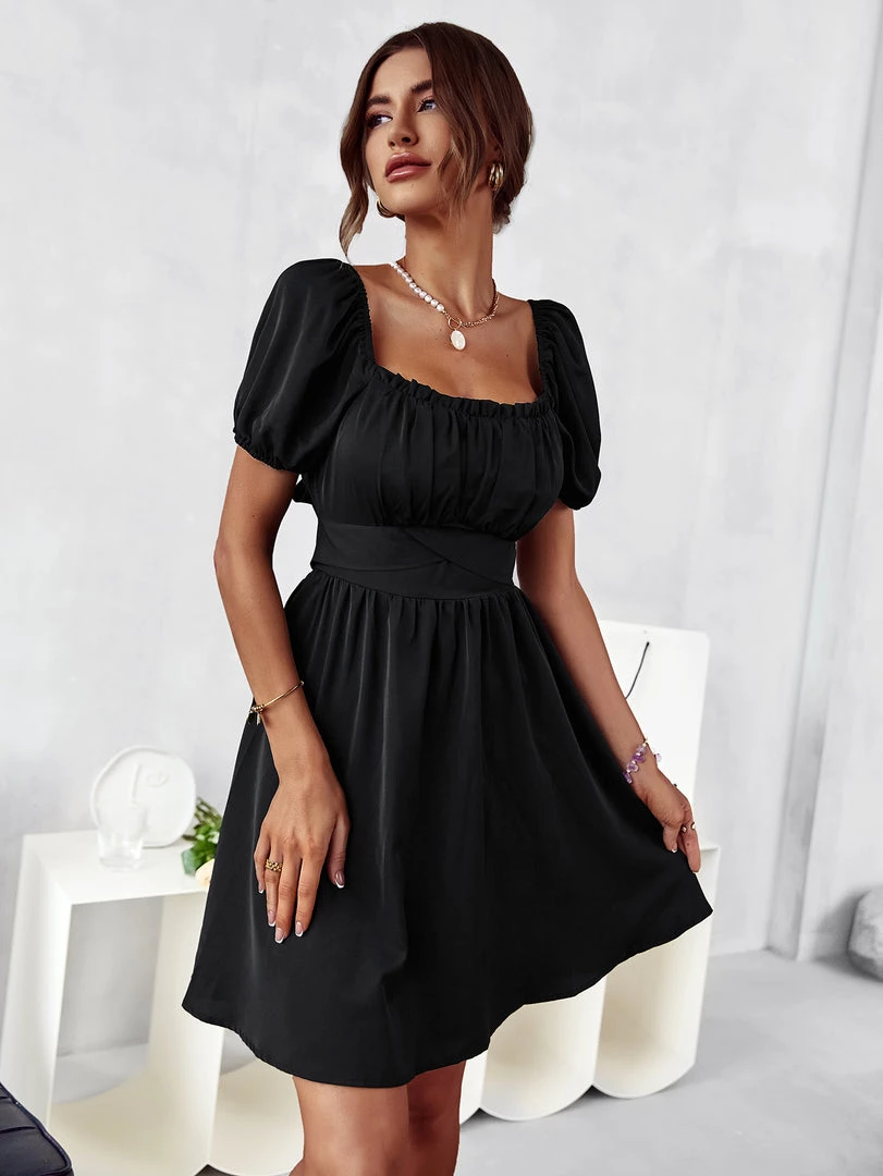 - Feature: Mini length. Relaxed fit. Square Collar. off-shoulder wearable. Tie back.