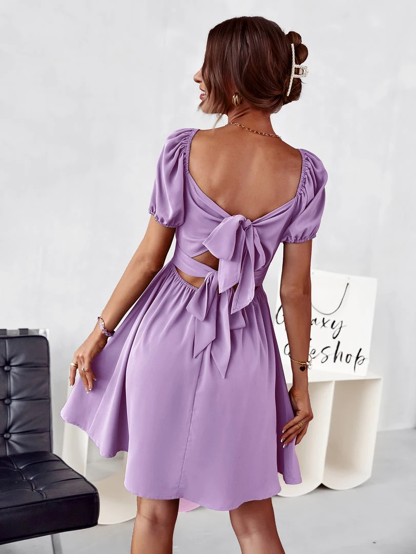 Our Maude Dress comes in a natural lilac tone. It features a square neckline, short sleeves and double bow tie back for a relaxed, comfortable fit. This flowy midi pairs with heels or tan sandals for an effortless trans seasonal look!