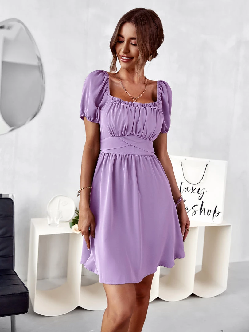 - Feature: Mini length. Relaxed fit. Square Collar. off-shoulder wearable. Tie back.