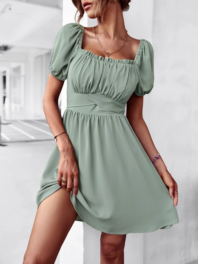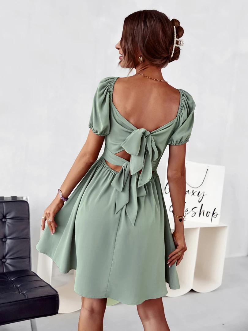 - Feature: Mini length. Relaxed fit. Square Collar. off-shoulder wearable. Tie back.
