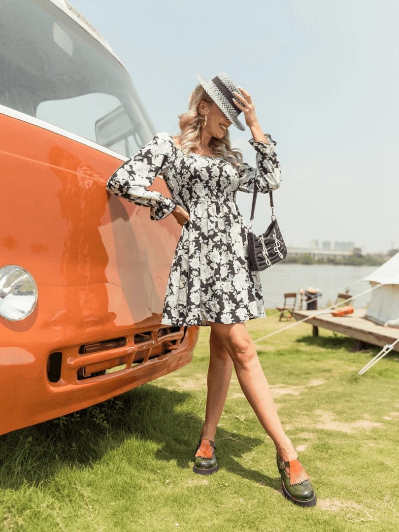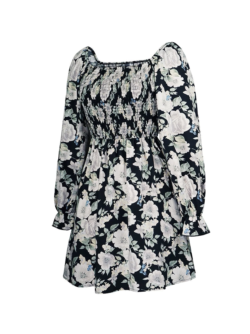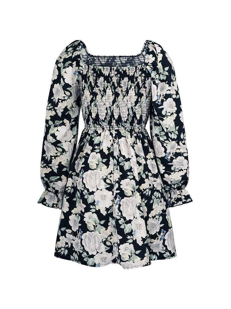 Our Mora Dress comes in a black tone with white floral print. It features a square neckline & long sleeves for a relaxed, comfortable fit. This flowy midi is a wonderful addition to your summer wardrobe!