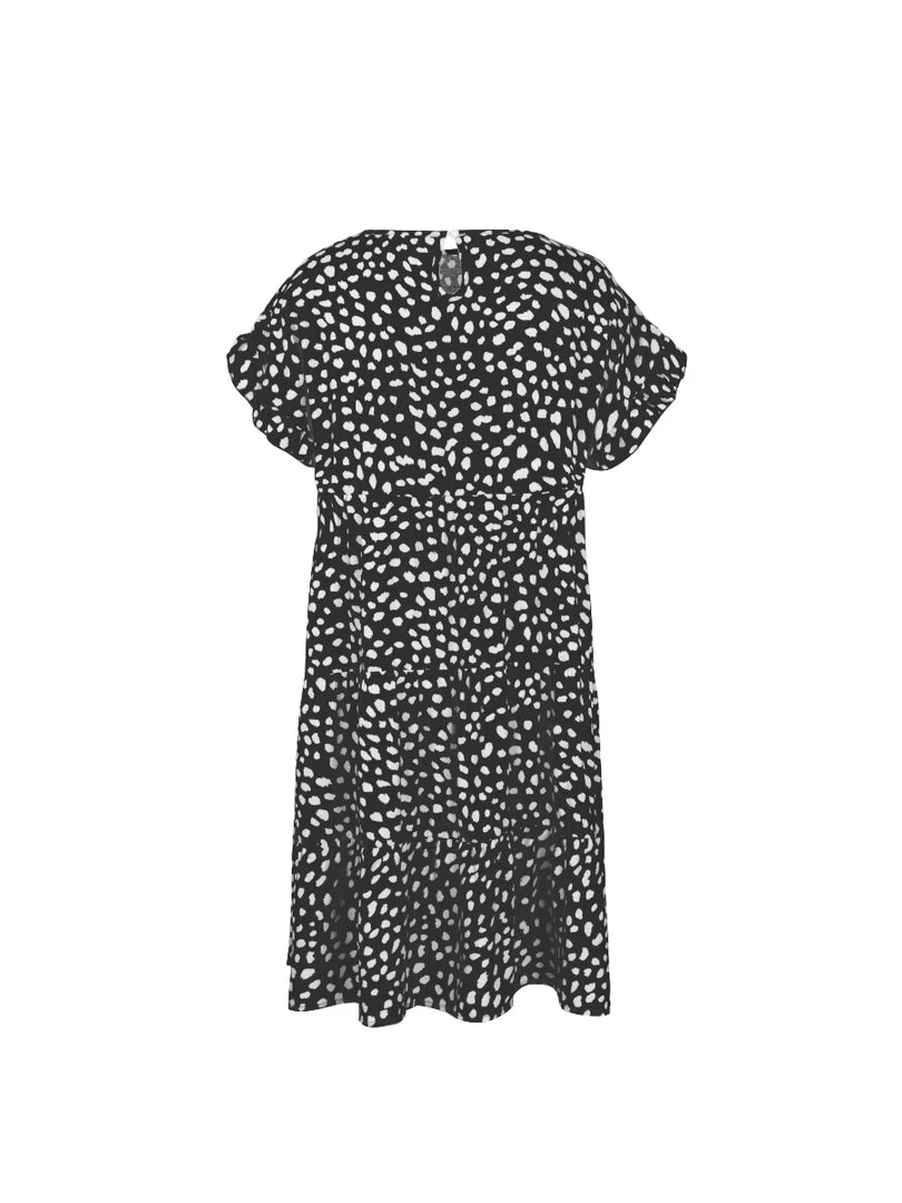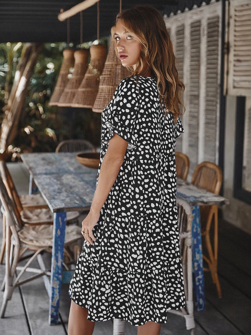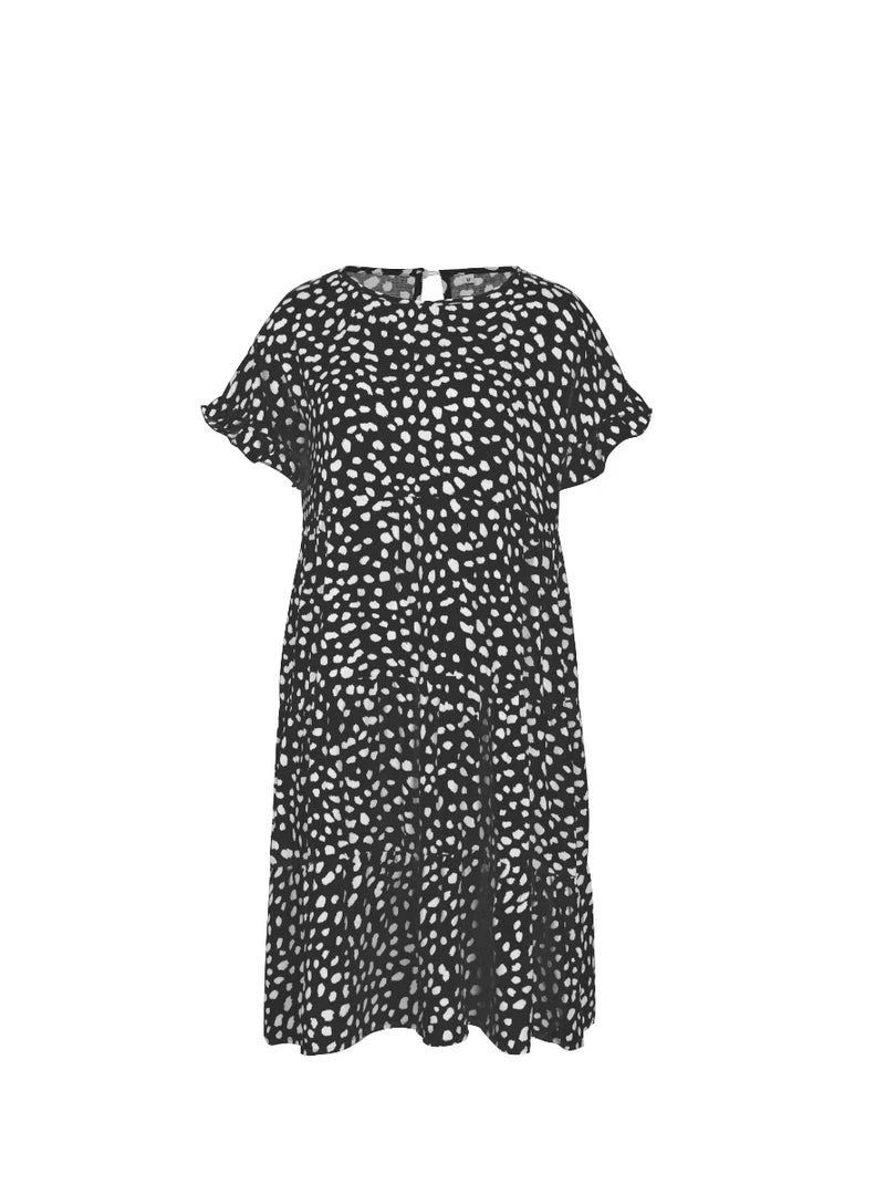 Our Bronwyn Dress comes in a black toned base featuring a delicate white spot print in a relaxed fit. This mini features a keyhole back held with a button fastening and frill detailing on the hemline. This piece is perfect for throwing on and grabbing coffee with the girls on a spring day.