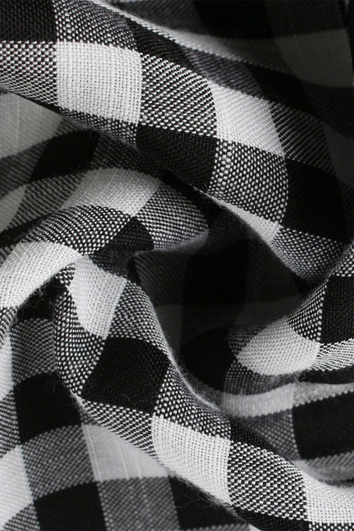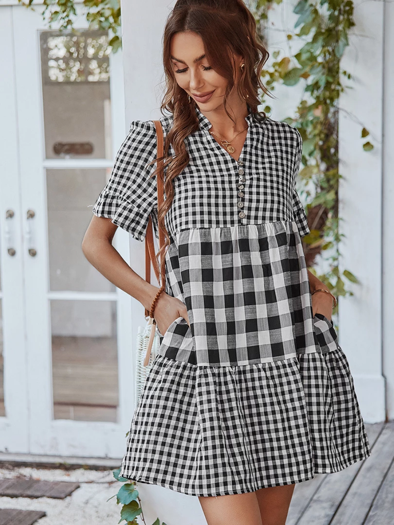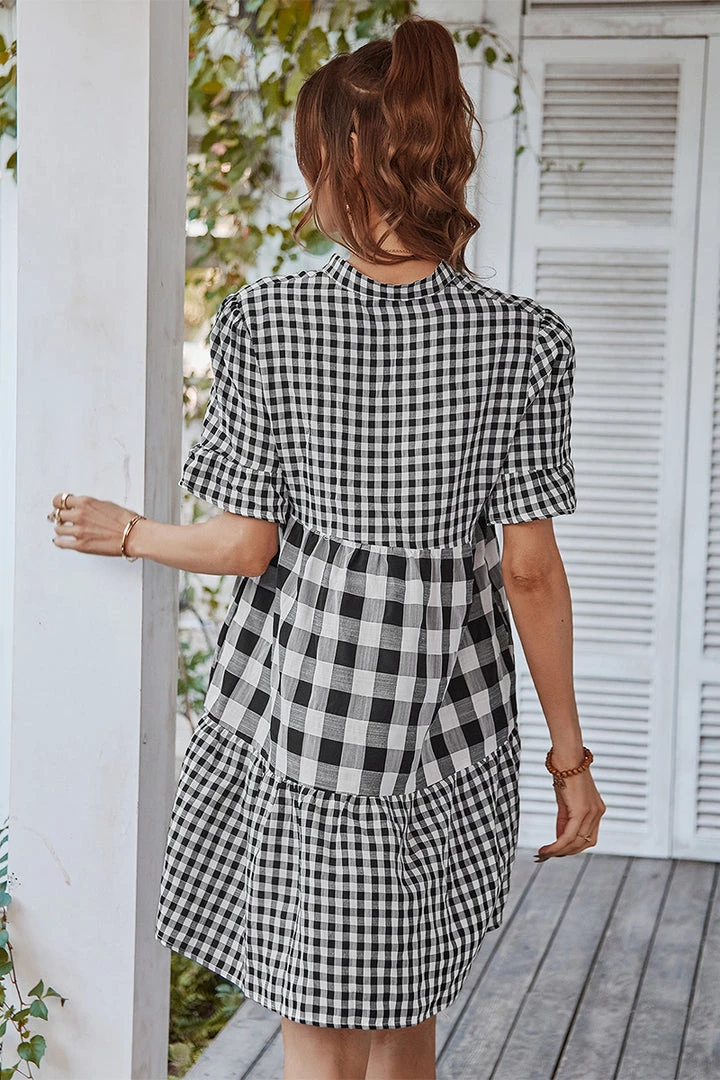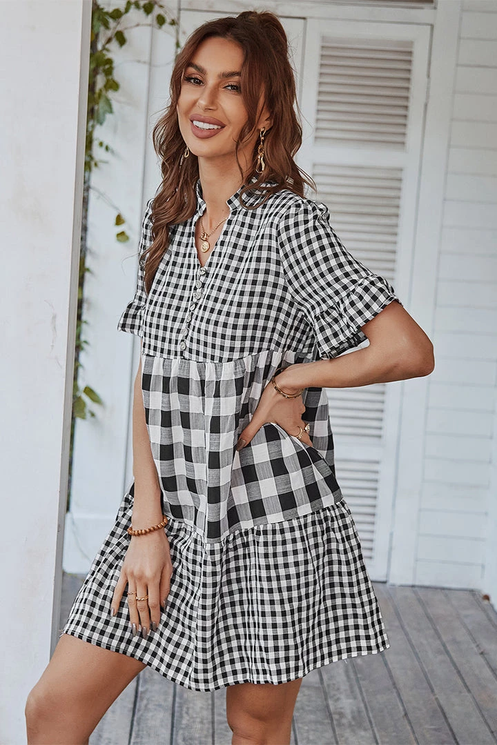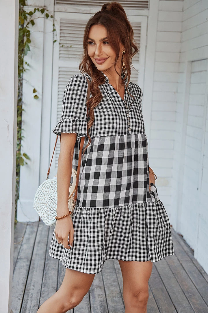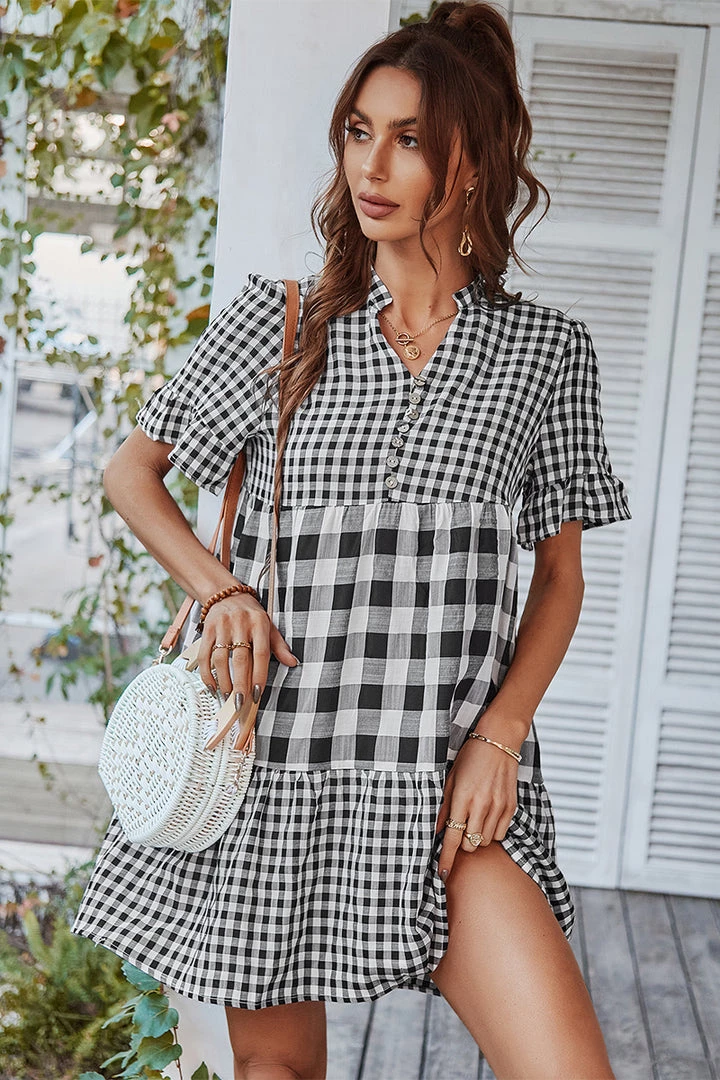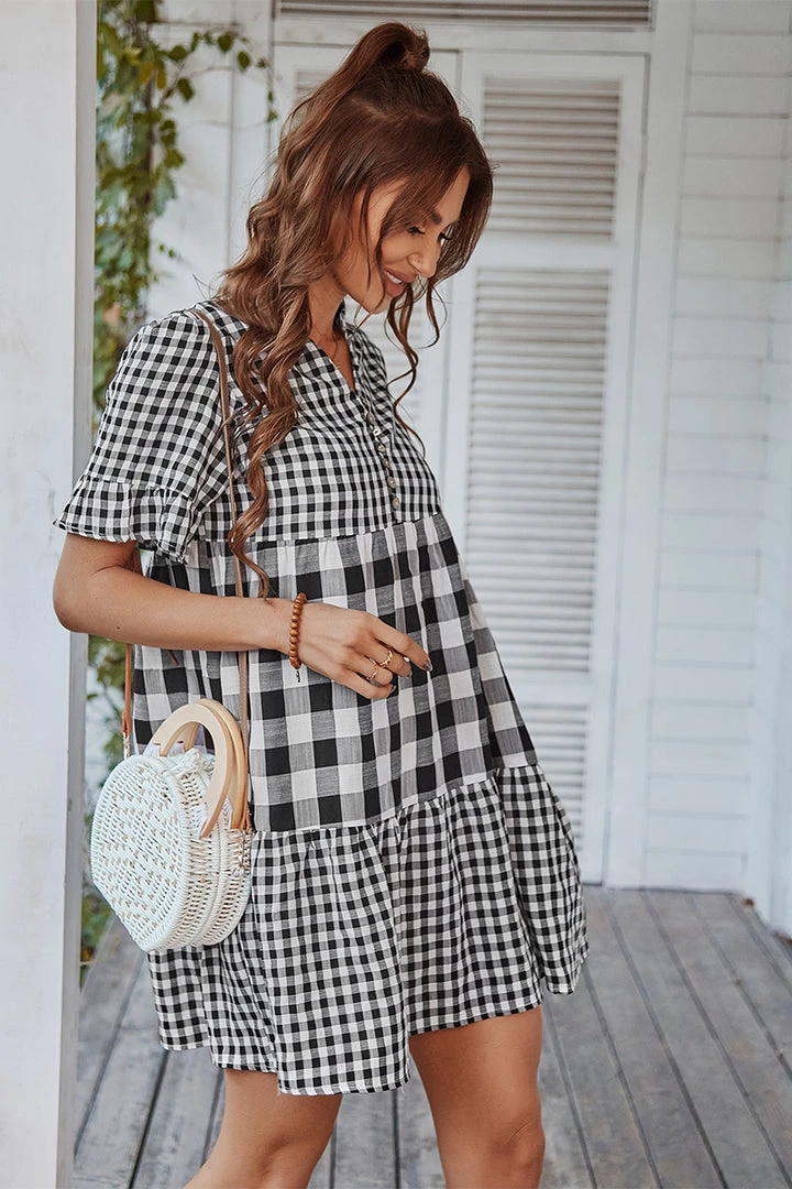 Our Genista Dress comes in a black & white tone check print. It features a v neckline and ruffle hem short sleeves for a relaxed comfortable fit. This gingham mini pairs beautifully with our heels or sandals for a fun casual look!