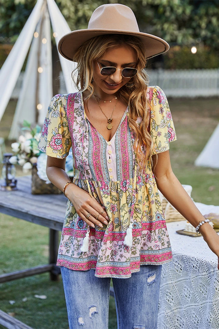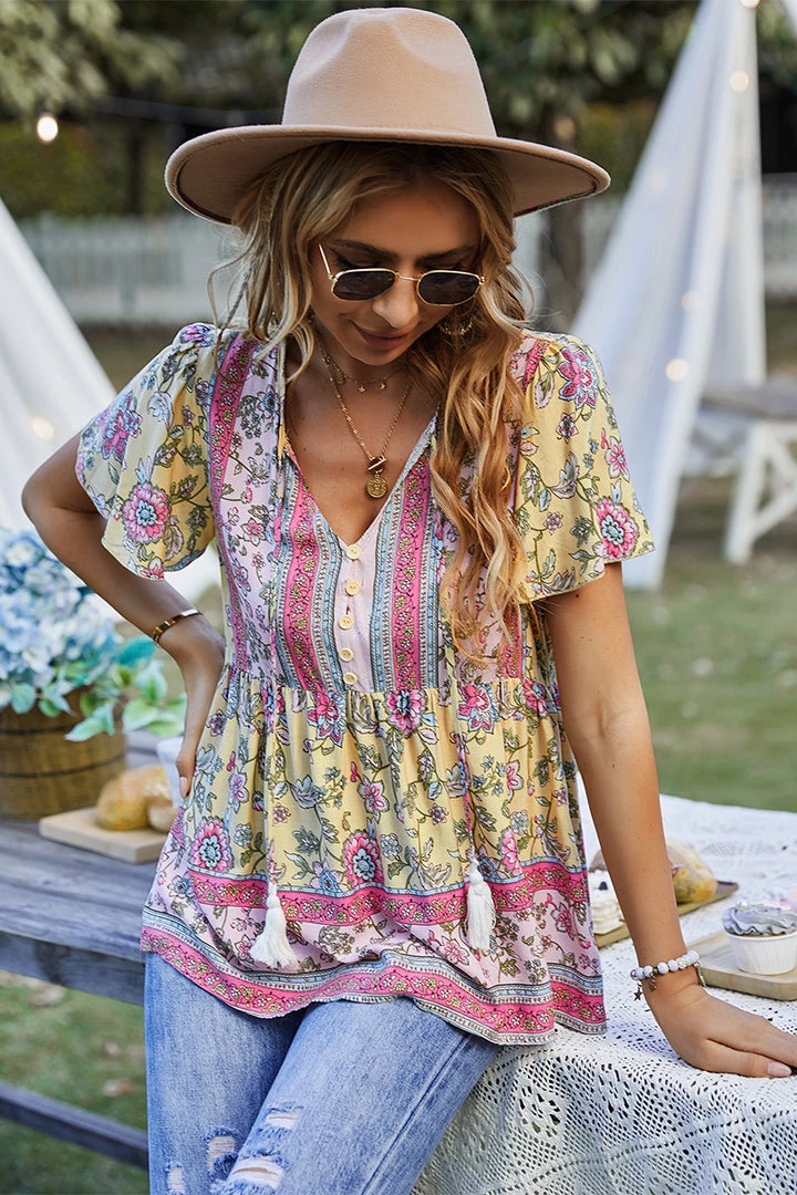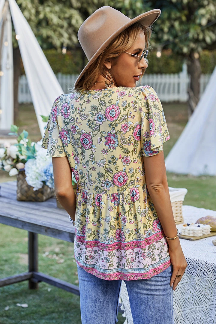 Our Jen Top is a light yellow base with a pink, blush & blue tone floral print. It features a v neckline and short sleeves for a relaxed, comfortable fit. This top pairs beautifully with basic pants for a fun casual look!