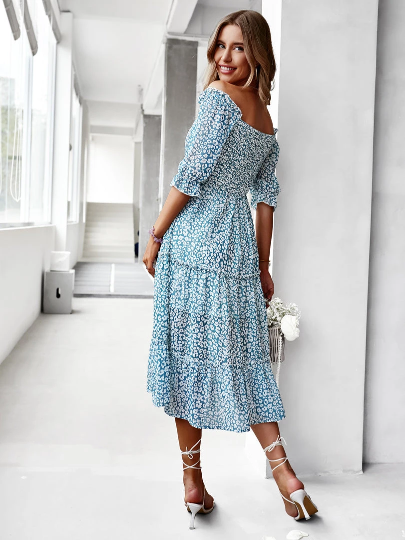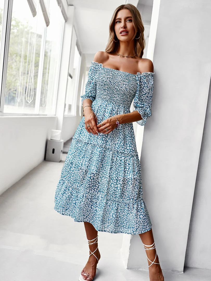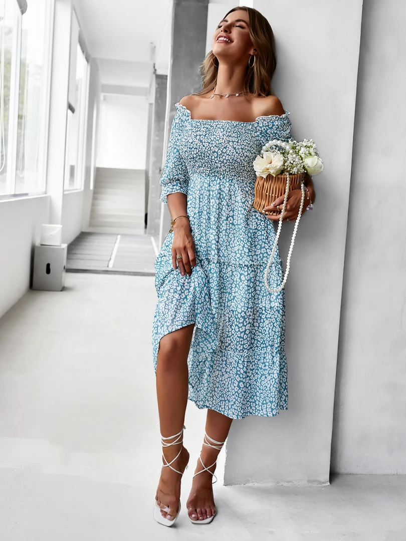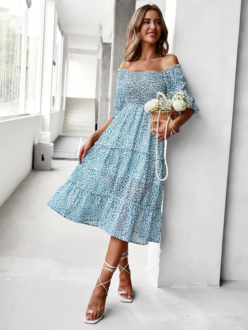 Our Laurisa Dress comes in a cadet blue base, with a white spot print. It features an off-shoulder neckline, short sleeves. This flowy midi pairs beautifully with our designer heels for a stunning seasonal look!