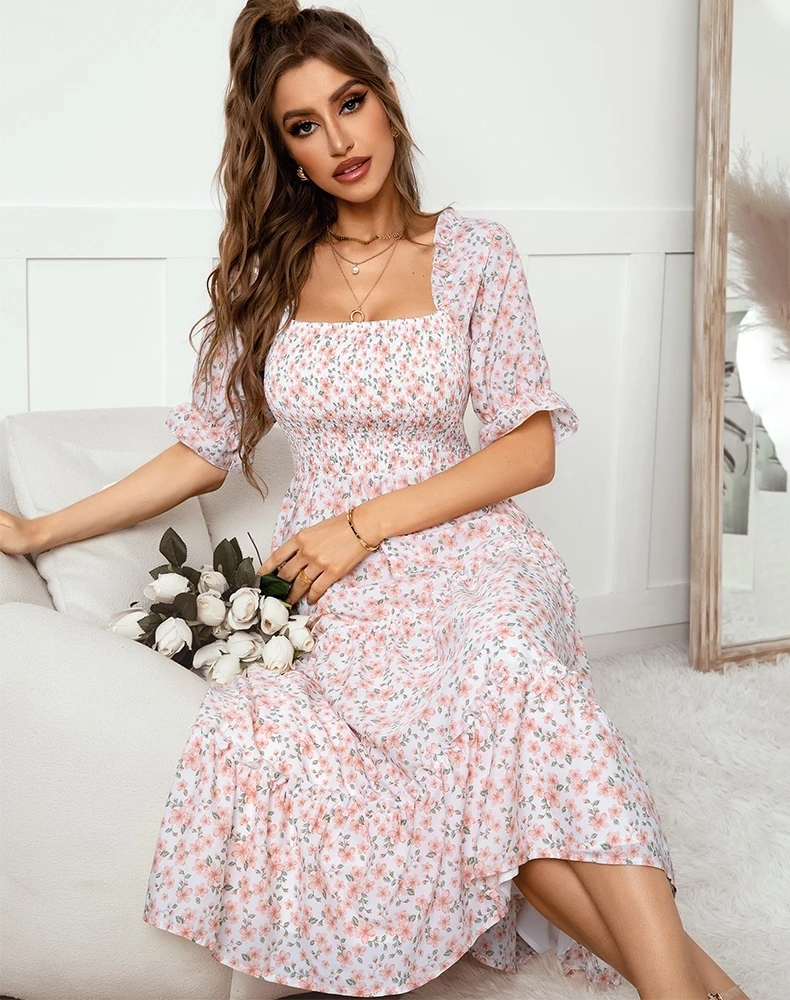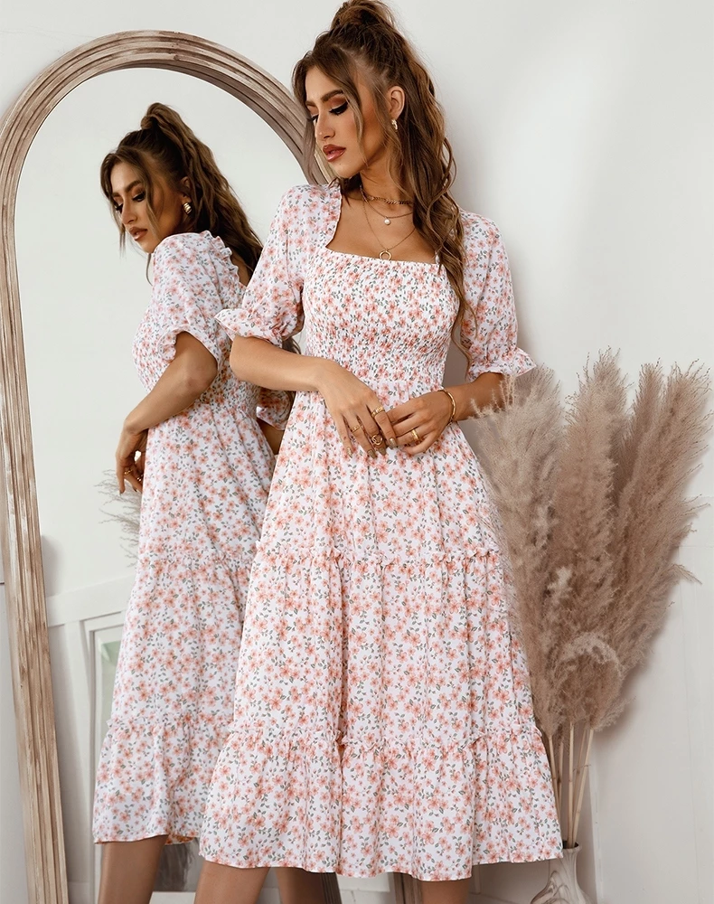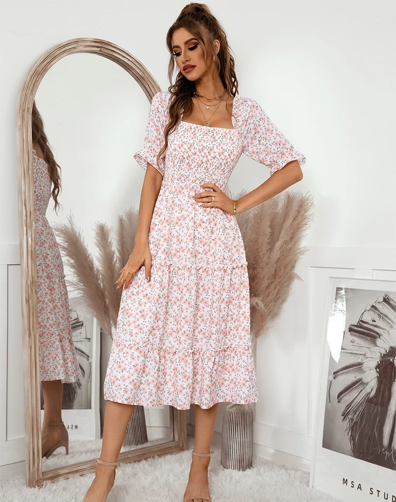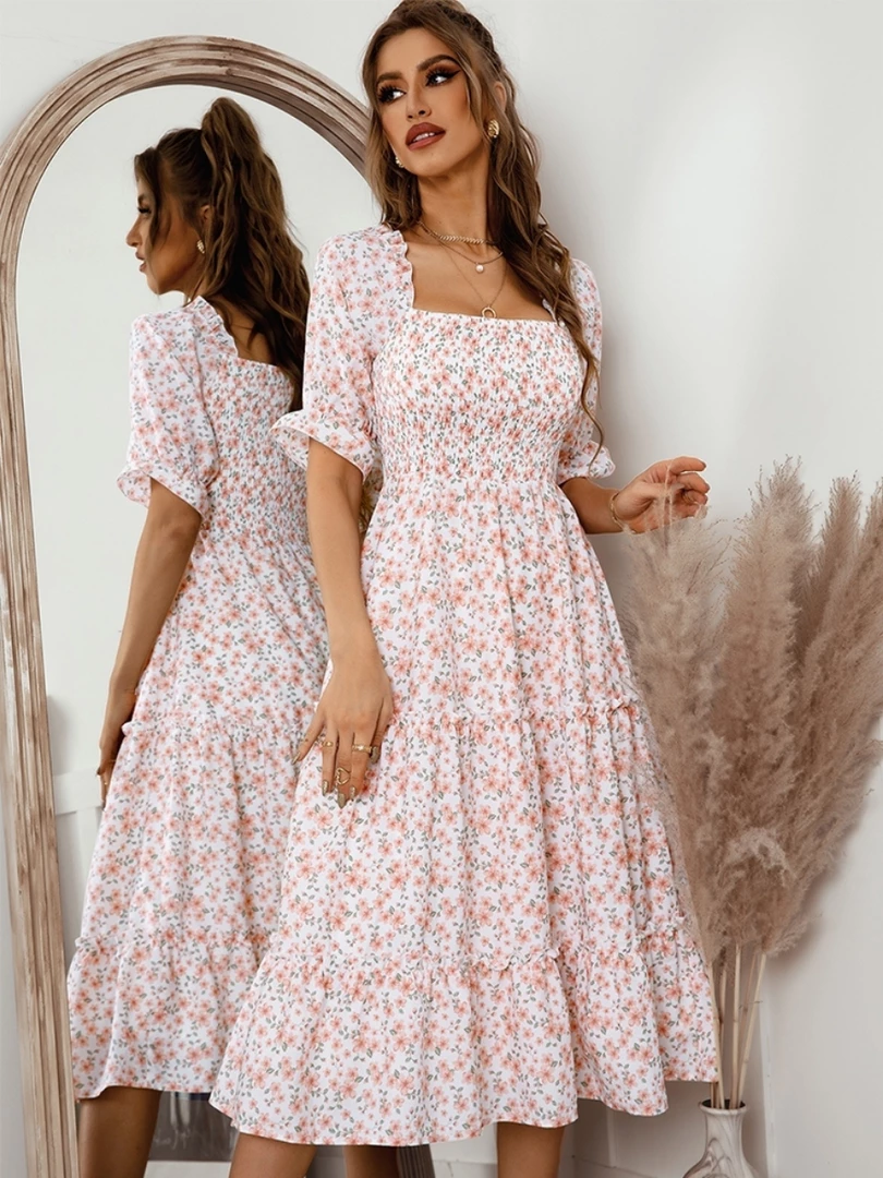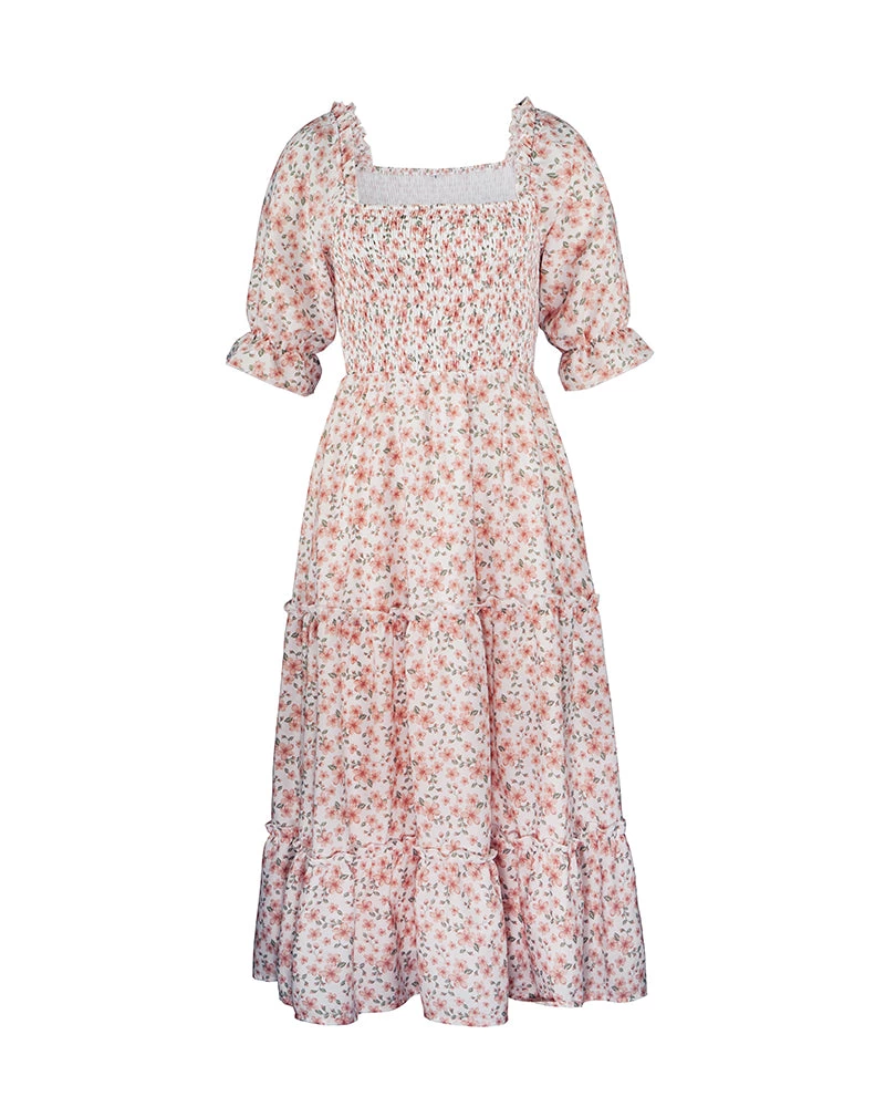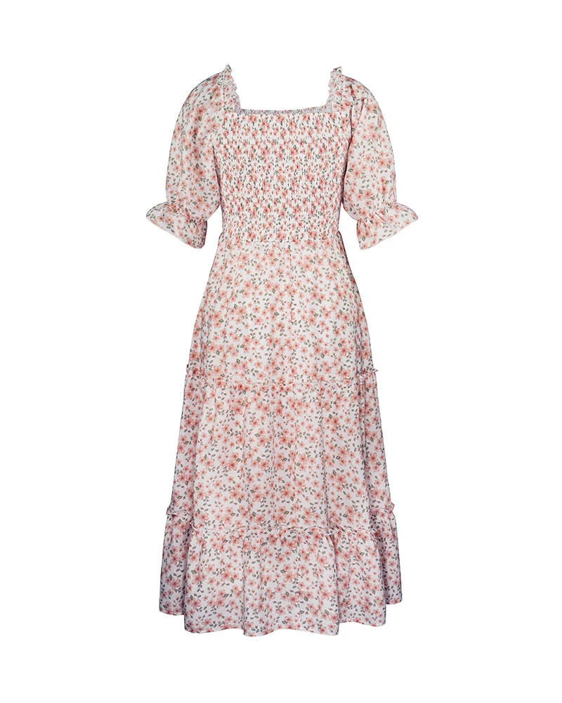 Our Owena Dress comes in a white tone base, with a pink floral print. It features a open square gathered neckline and waist to cinch in the figure beautifully. This flowy midi is a gorgeous addition to your spring wardrobe!