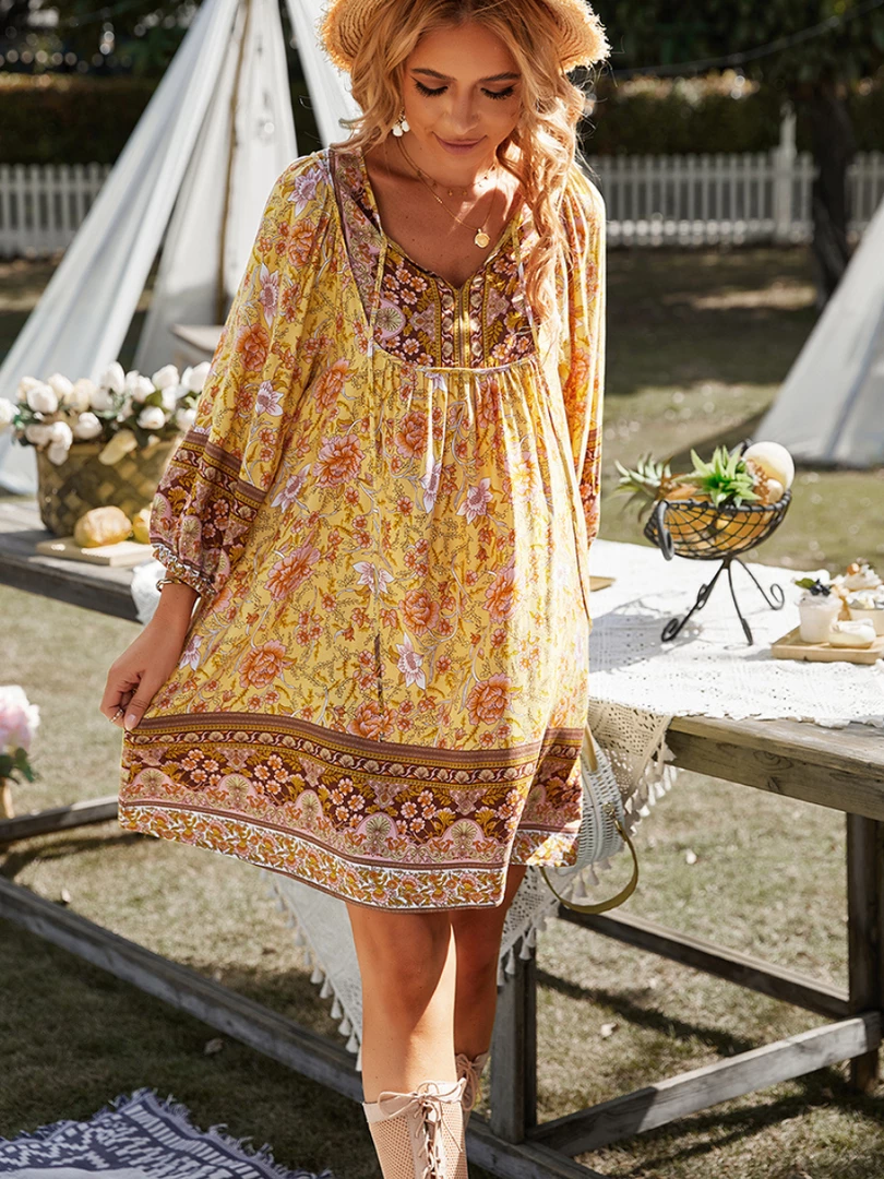 Our Aurina Dress comes in a yellow tones of pink and brown floral prints. It’s a gorgeous lightweight material perfect for transitioning you to Spring. The peasant v neckline with tassel finishes is a gorgeous addition to this bohemian style. The short bishop sleeves are cinched with elastic on the cuffs making this practical and comfortable. The mini length is perfect for showing off your gorgeous legs!