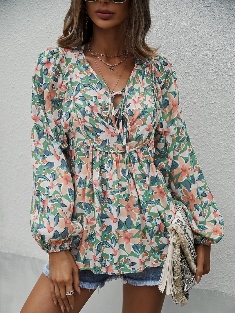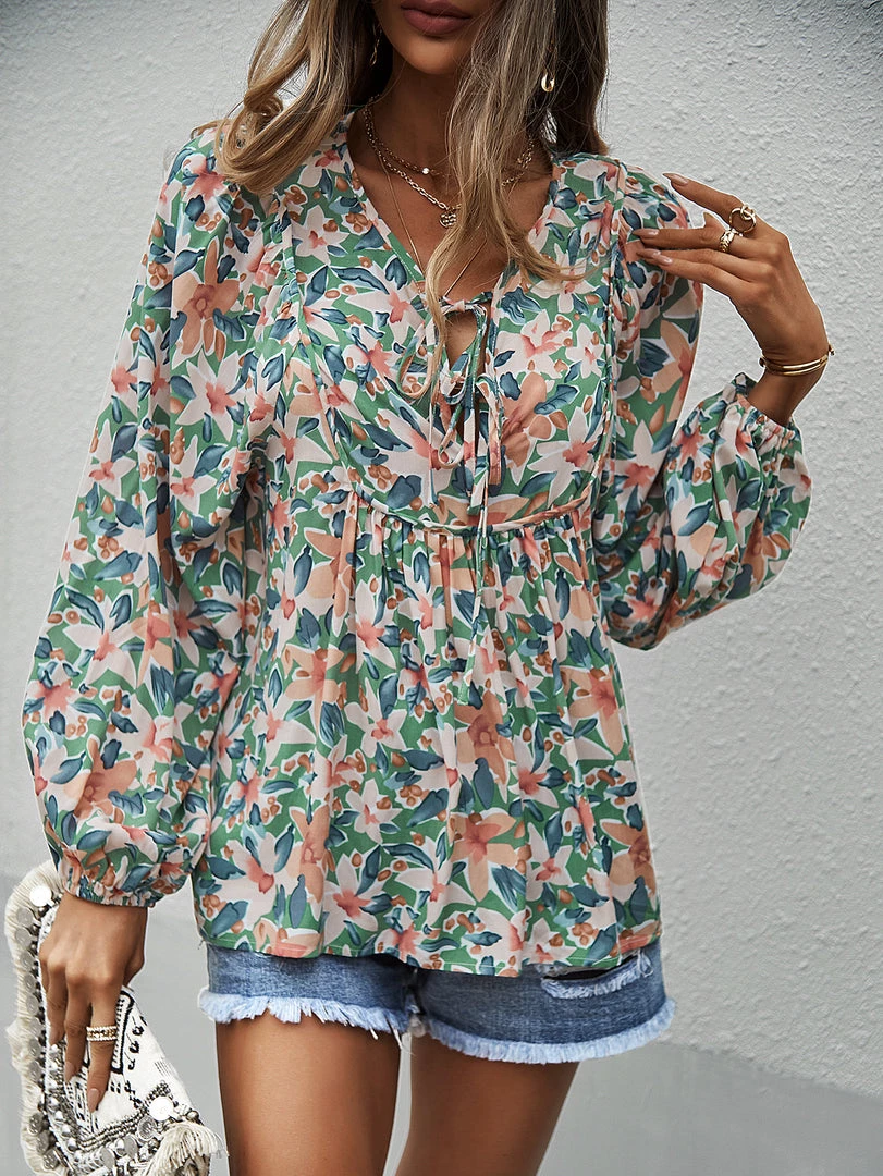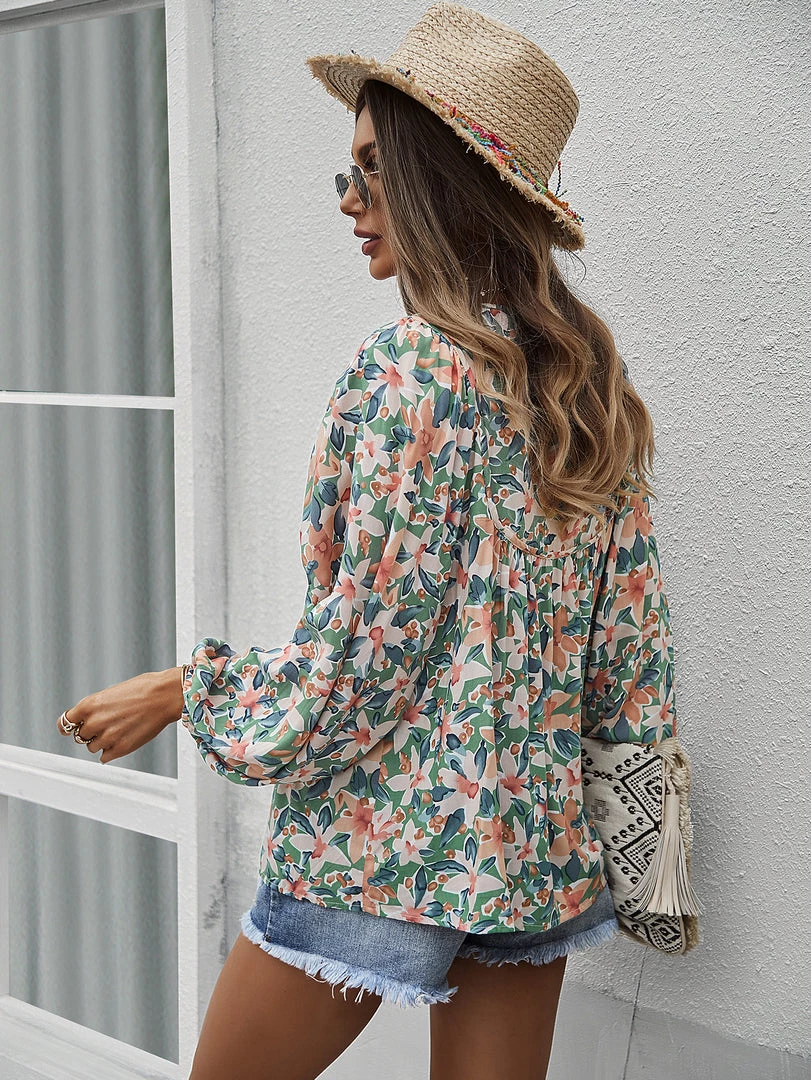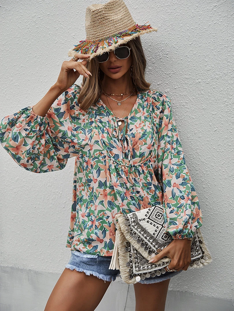 Our Dua Lipa Top comes in a beautiful green tone featuring a contrasting pink floral print in a relaxed fit. The neckline with string, cuffed sleeves and gathered detailing gives this boho piece a structured yet flowy look. Pair with our heels and sandals for an easy summer look.