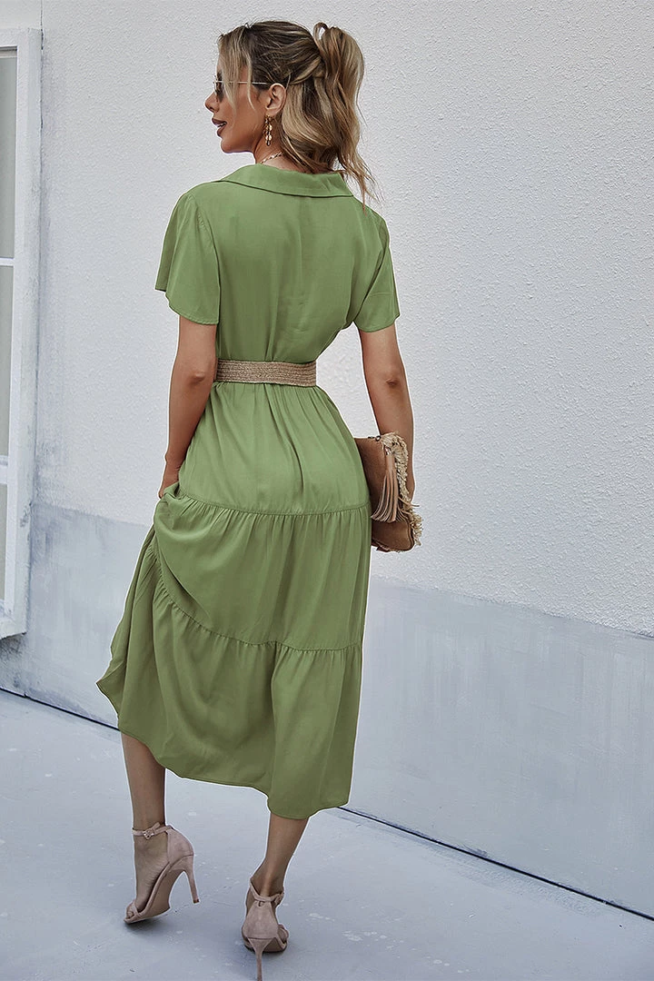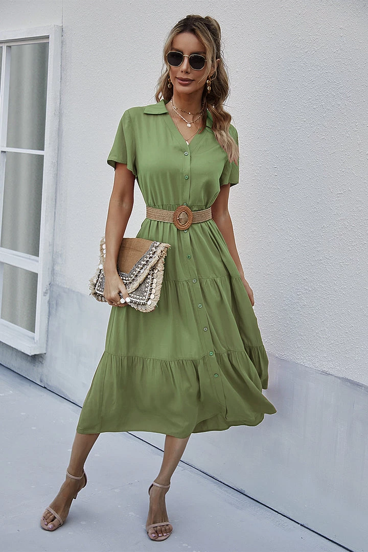 Our Emily Dress comes in a classic pickle green tone in a relaxed fit. This breezy midi features a collared V neck with functional buttons down the front, perfect for breastfeeding mums. The relaxed short sleeves and tiered skirt makes this piece such a comfortable wear.