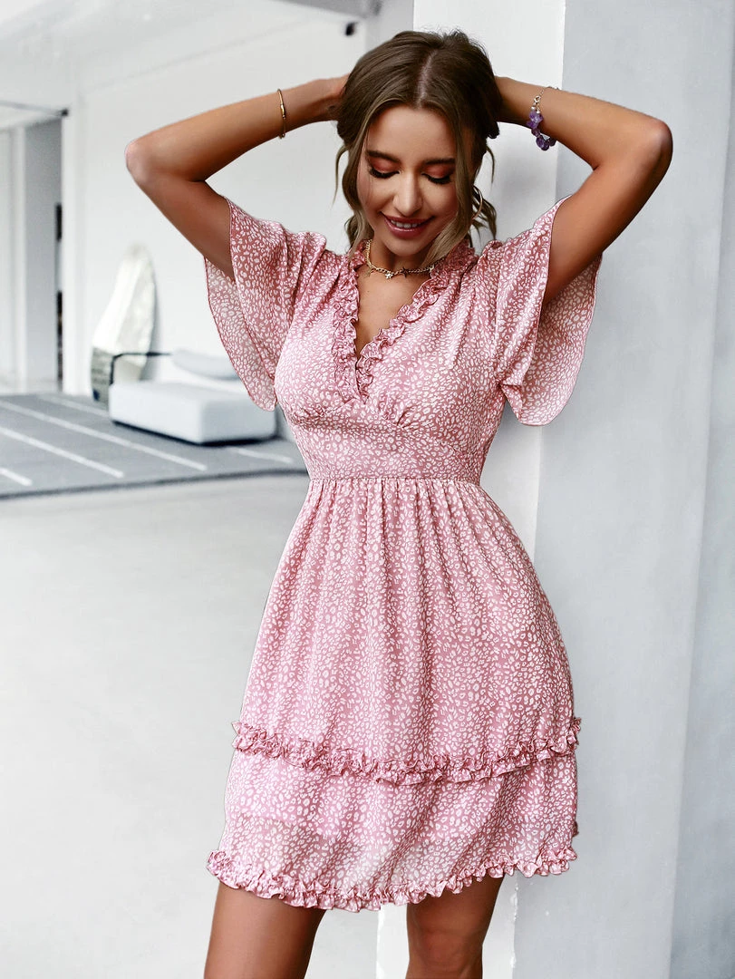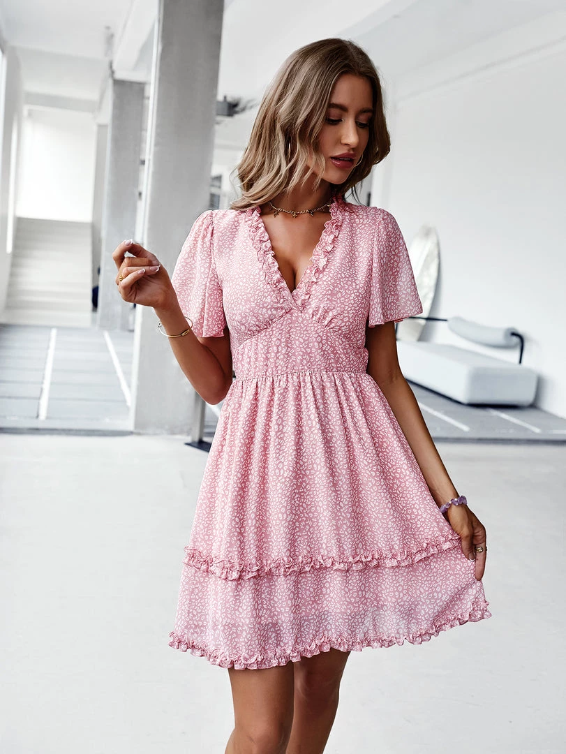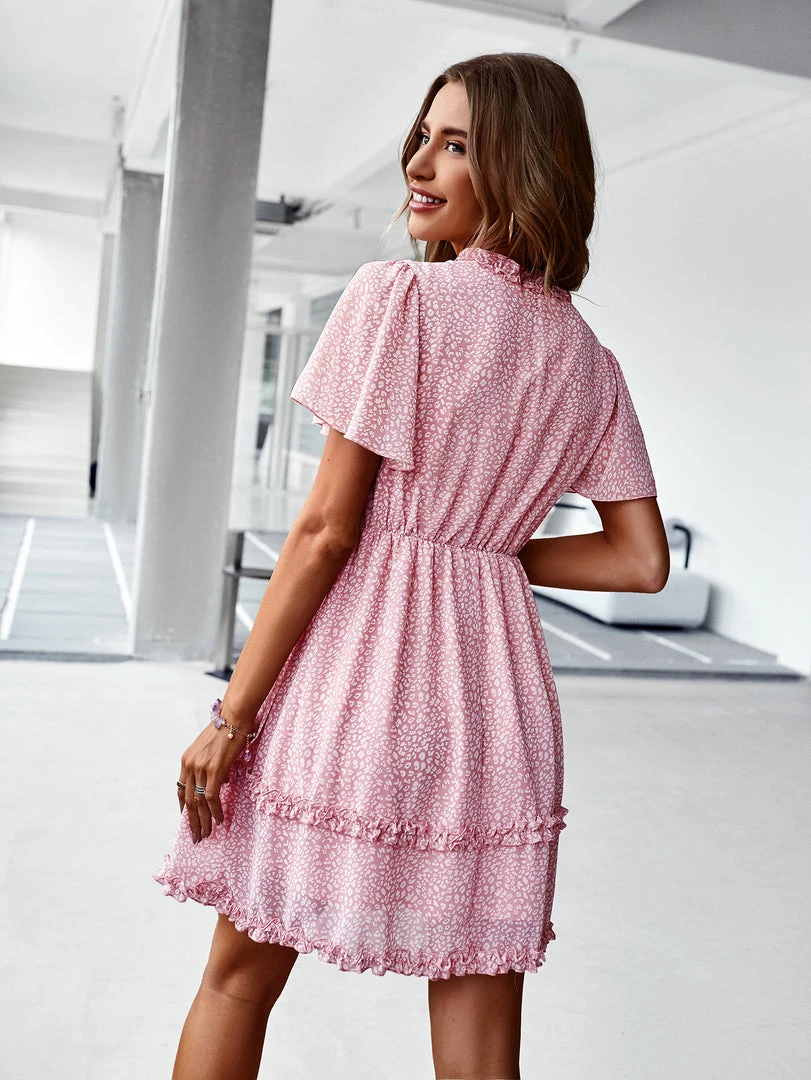 Our Magdaleine Dress comes in a soft pink tone featuring a delicate white spot print in a relaxed fit. This mini features a V neckline with ruffle trim detailing, short sleeves and a tiered skirt. This beautiful piece is perfect for a romantic spring and summer date!