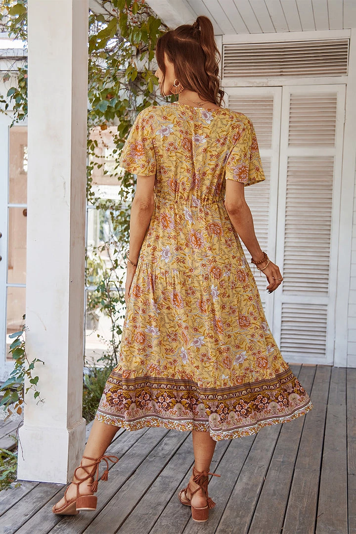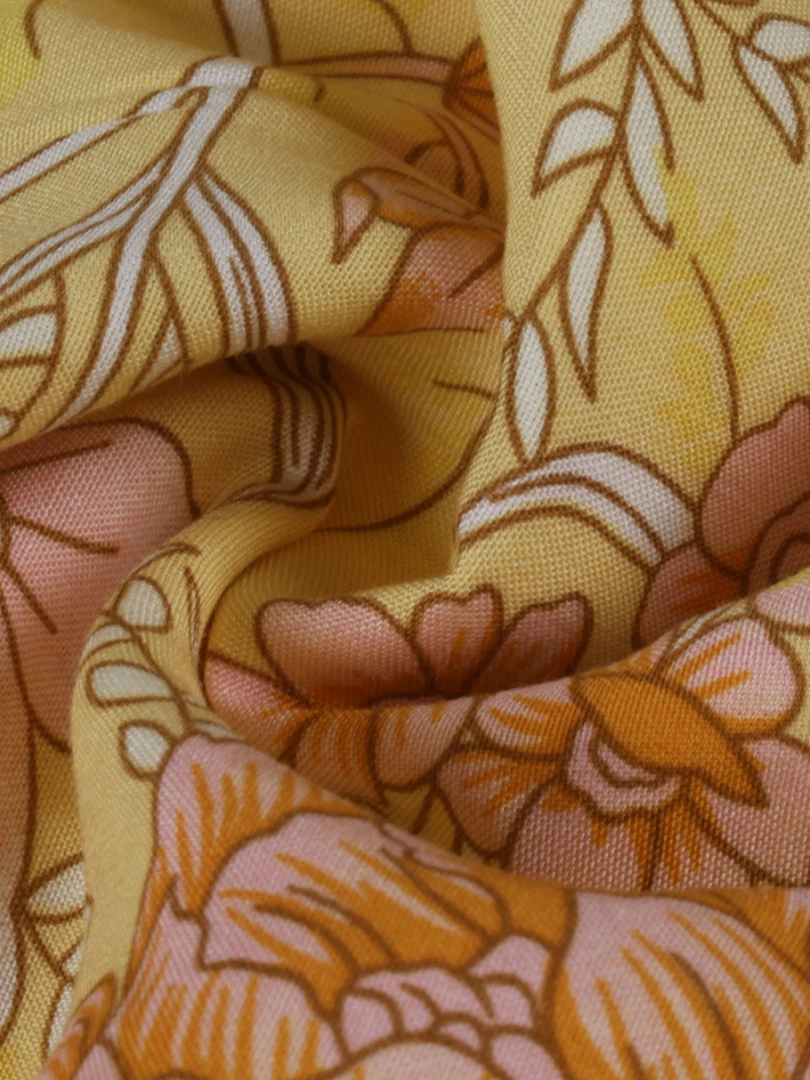 Our Ricarda Dress features a yellow base with orange floral prints. It’s a gorgeous lightweight material ideal in a relaxed mini dress silhouette that is perfect for days spent in the sunshine. The V neckline is met with buttons making this ideal for breastfeeding. The short sleeves flutter out and are a feminine complementary feature to the gorgeously gathered waist detailing of the garment. This boho midi pairs beautifully with our heels or sandals for a fun casual look!