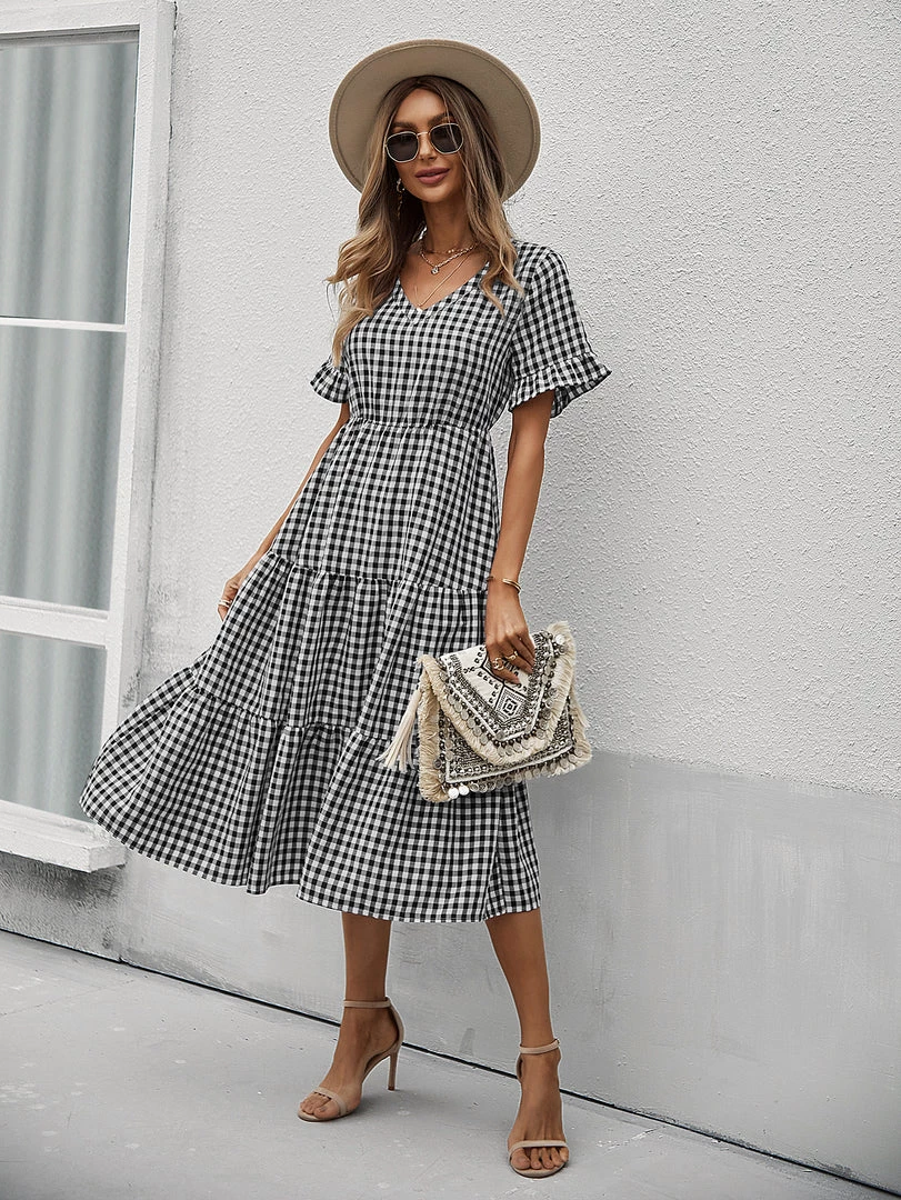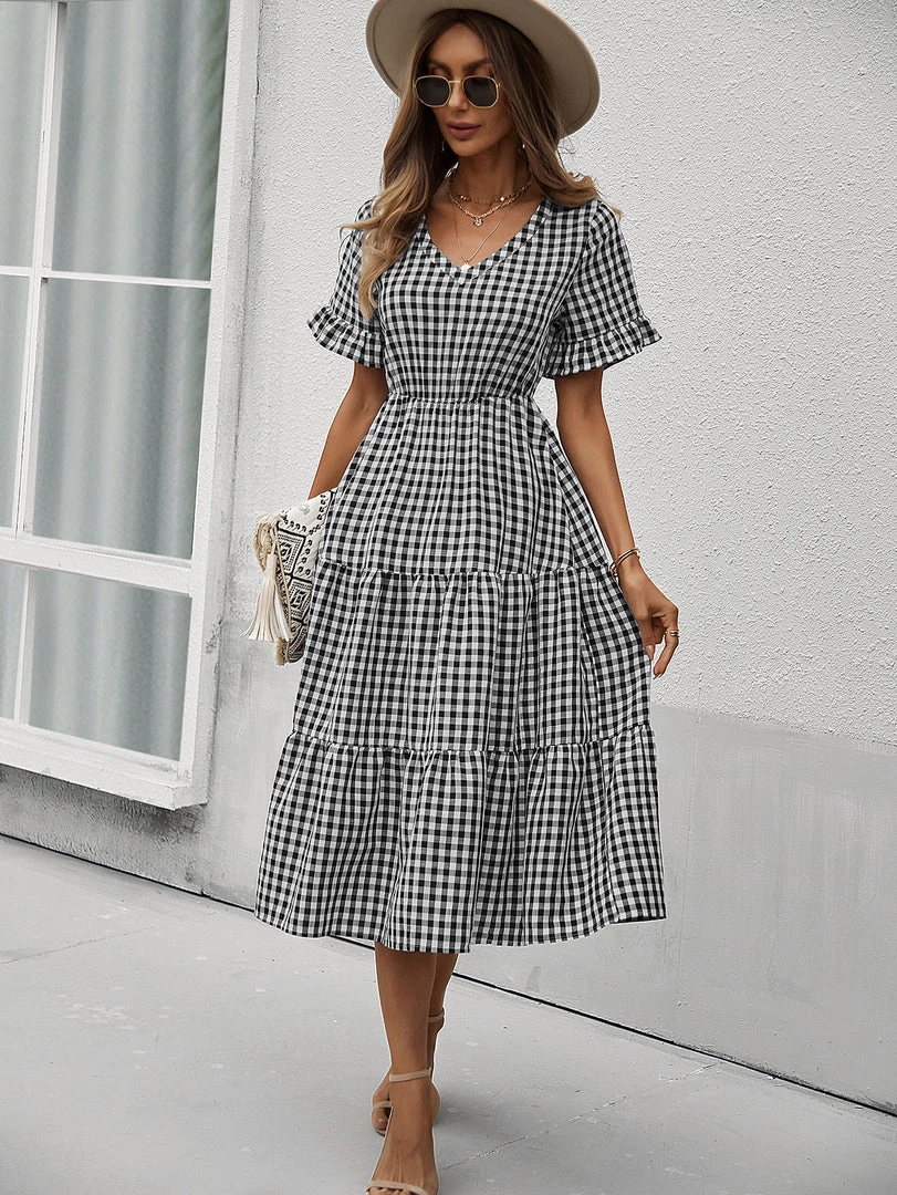 Our Shasta Dress comes in a black & white gingham print. This dress features short sleeves, and a tiered skirt, v neckline. The relaxed fit mid pairs beautifully with our heels or sandals for a fun casual look!