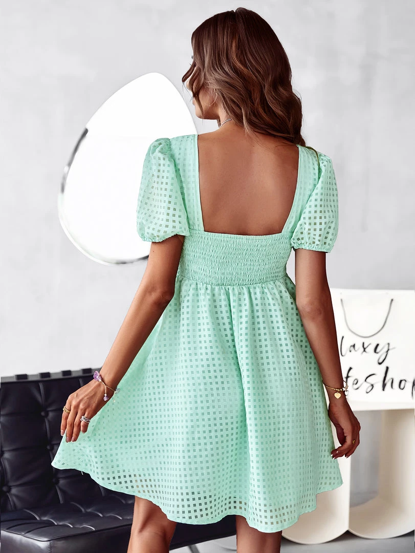Our Notepad Dress comes in a mint tone in a light weight, relaxed fit mini length. The classic square collar, short sleeves, tiered skirt and open back tare fab additions to this mini that you’re sure to love as the weather begins to warm. This flowy mini pairs beautifully with our designer leather mules for a stunning seasonal look!