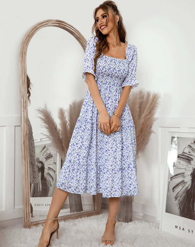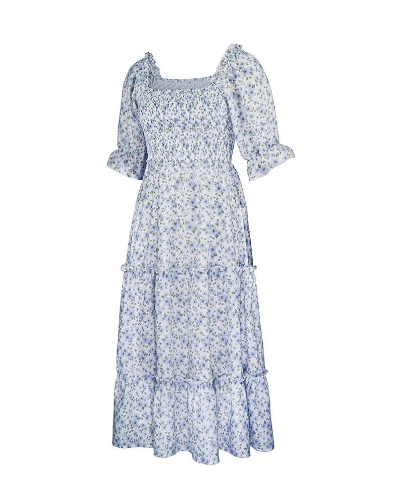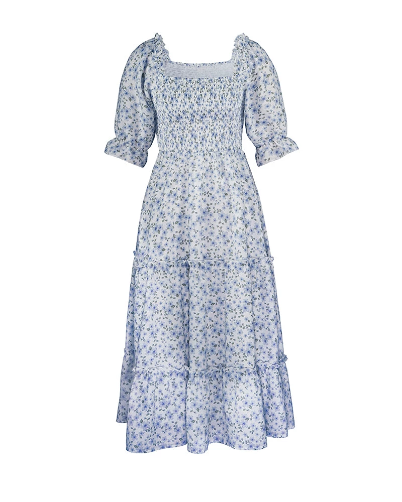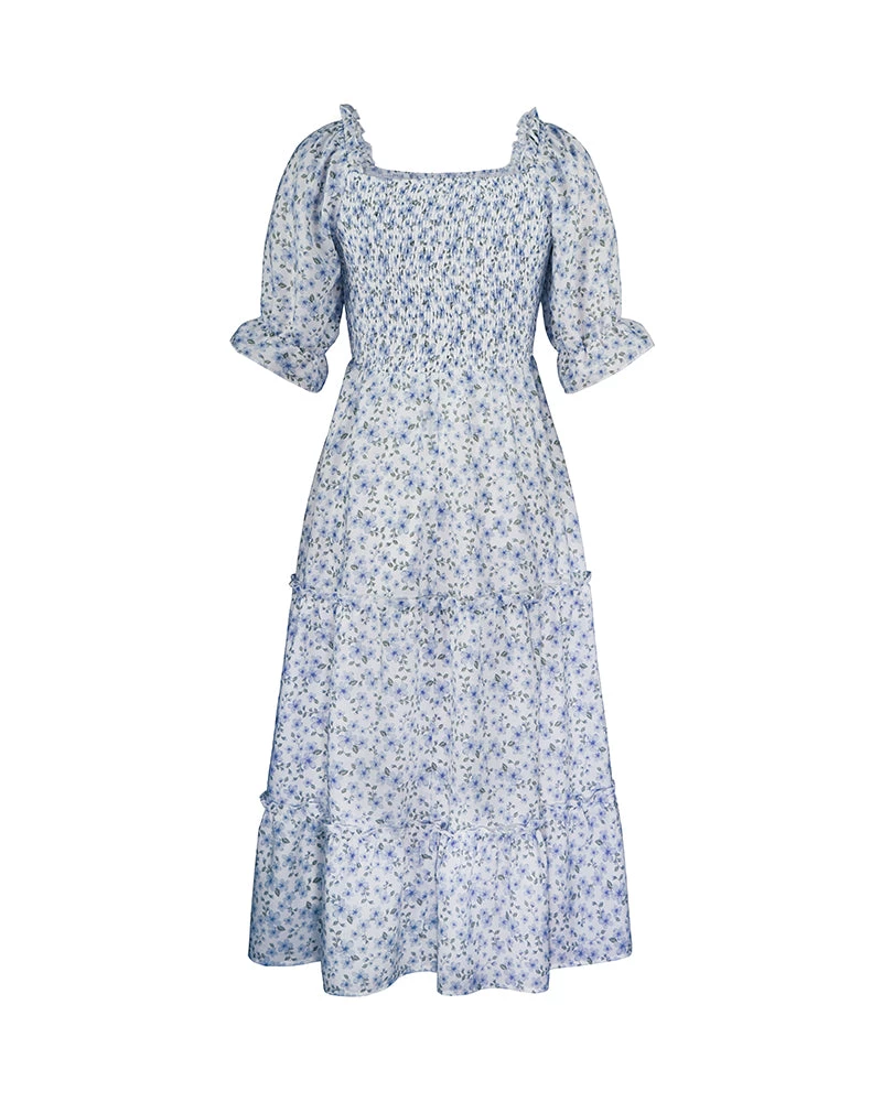 Our Owena Dress comes in a white tone base, with a blue floral print. It features a open square gathered neckline and waist to cinch in the figure beautifully. This flowy midi is a gorgeous addition to your spring wardrobe!