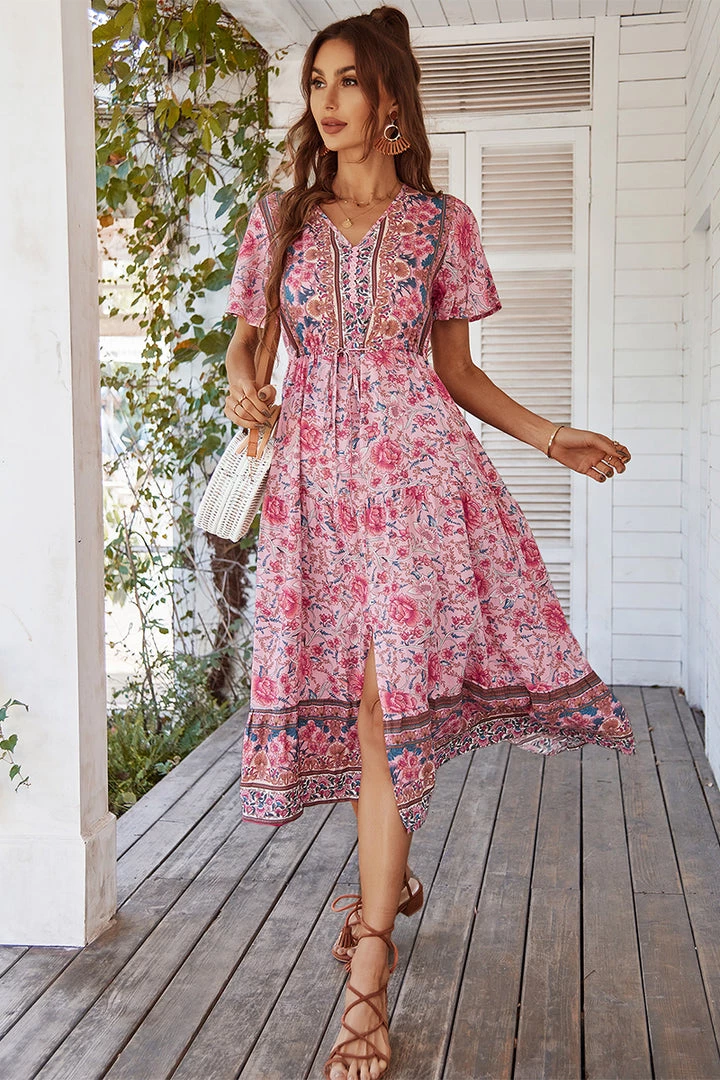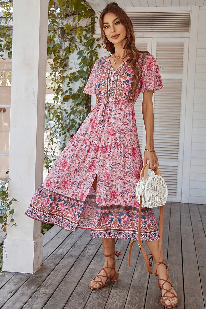 Our Ricarda Dress features a gentle blush base with pink floral prints. It’s a gorgeous lightweight material ideal in a relaxed mini dress silhouette that is perfect for days spent in the sunshine. The V neckline is met with buttons making this ideal for breastfeeding. The short sleeves flutter out and are a feminine complementary feature to the gorgeously gathered waist detailing of the garment. This boho midi pairs beautifully with our heels or sandals for a fun casual look!