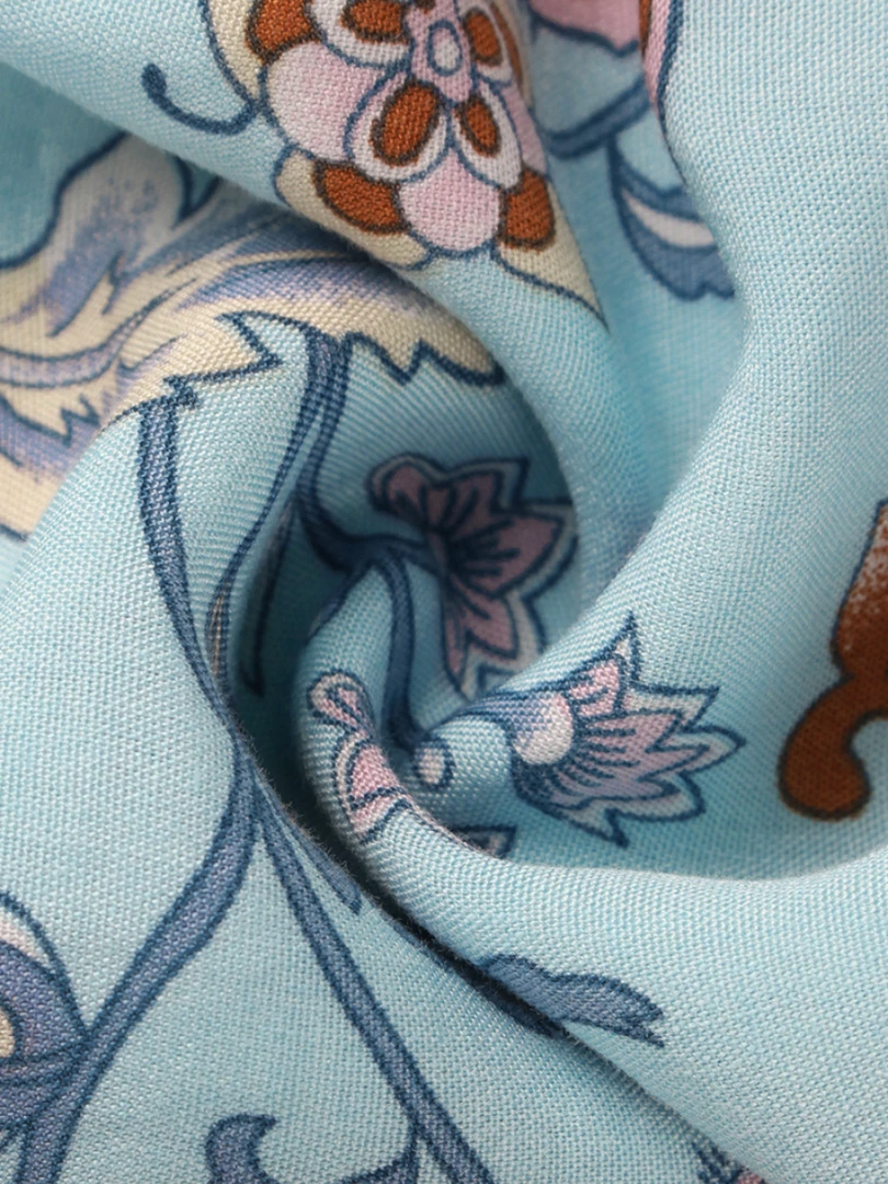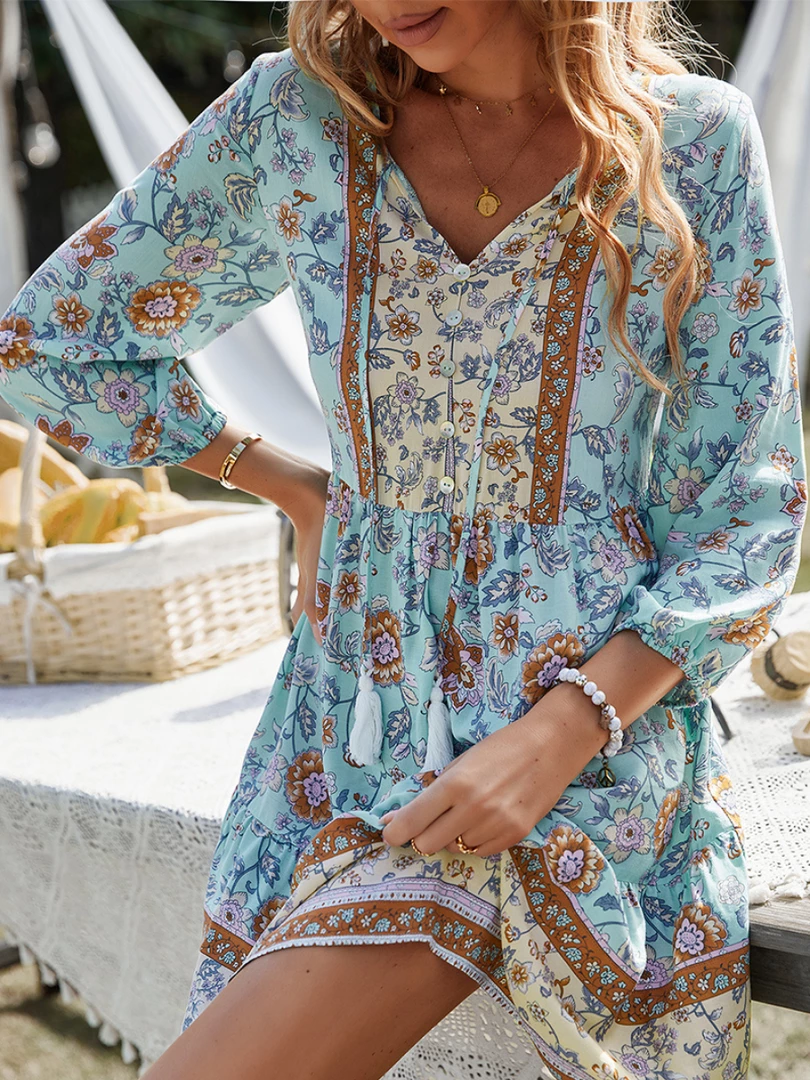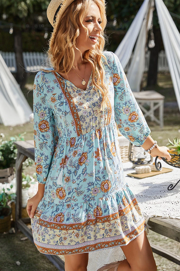 Our Rina Boho Dress comes in a light blue base with tones of floral prints. It’s a gorgeous lightweight material perfect for transitioning you to Spring. The peasant v neckline with tassel finishes is a gorgeous addition to this bohemian style. The short bishop sleeves are cinched with elastic on the cuffs making this practical and comfortable. The mini length is perfect for showing off your gorgeous legs!