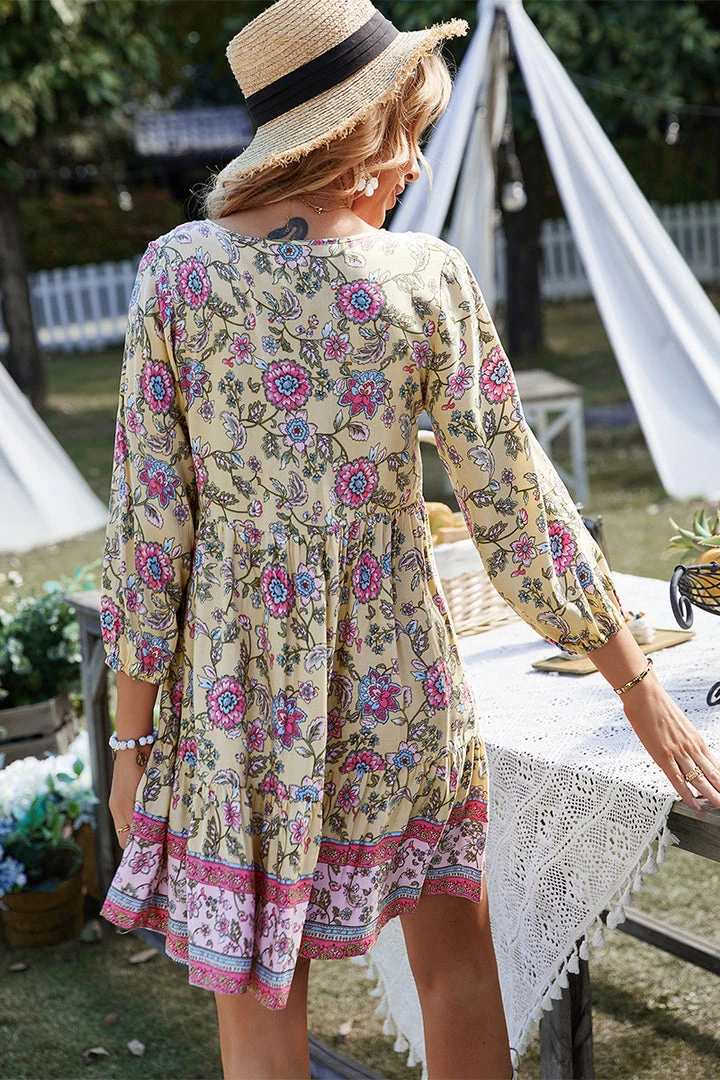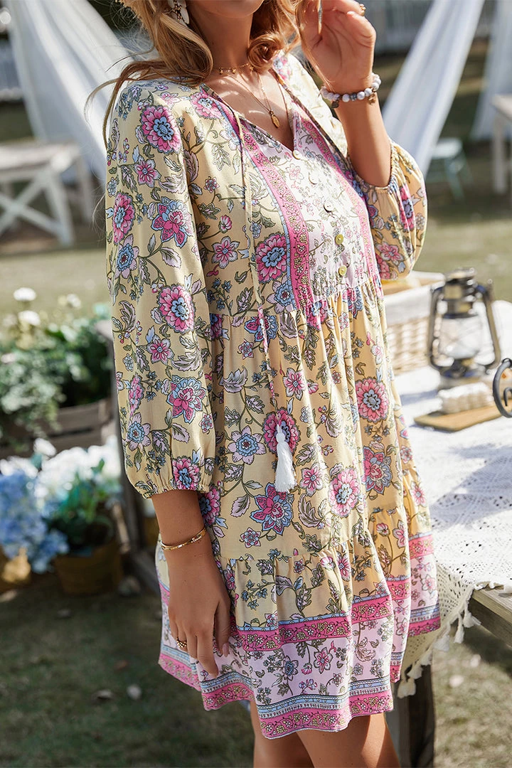 Our Rina Boho Dress comes in a creamy beige base with tones of floral prints. It’s a gorgeous lightweight material perfect for transitioning you to Spring. The peasant v neckline with tassel finishes is a gorgeous addition to this bohemian style. The short bishop sleeves are cinched with elastic on the cuffs making this practical and comfortable. The mini length is perfect for showing off your gorgeous legs!