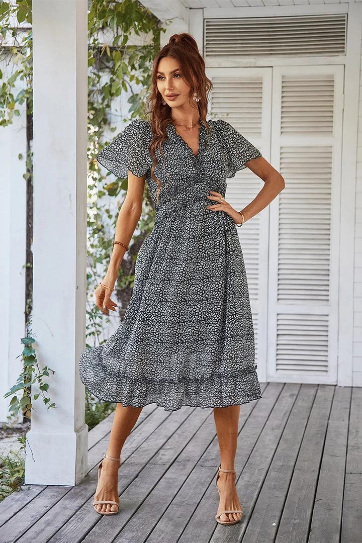 Our Rosalinda Dress comes in a black tone base, with a white tone print. It features a v neckline, short sleeves, and a layered skirt. This flowy midi pairs beautifully with our heels or sandals for a fun casual look!