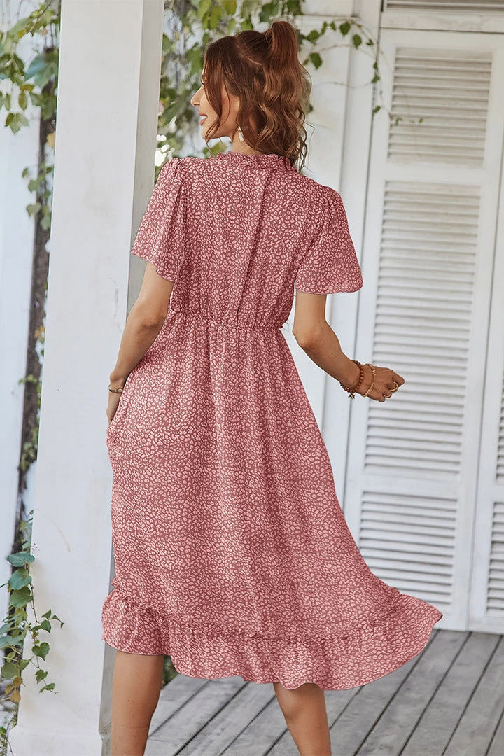 Our Rosalinda Dress comes in a crepe pink tone base, with a white tone print. It features a v neckline, short sleeves, and a layered skirt. This flowy midi pairs beautifully with our heels or sandals for a fun casual look!