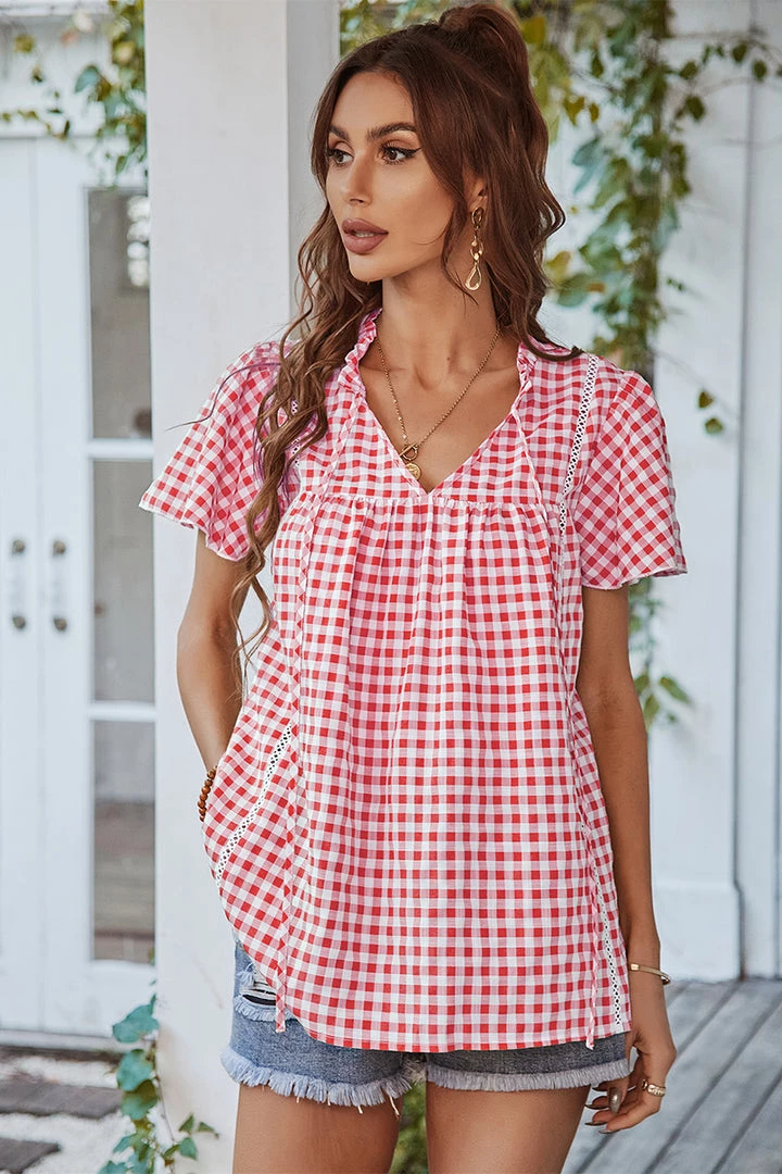 Our Rosenda Top comes in pink, red and white gingham color. This features a shirred bodice that promotes comfort! Pair with your favorite pants or shorts for an easy chic look! xo