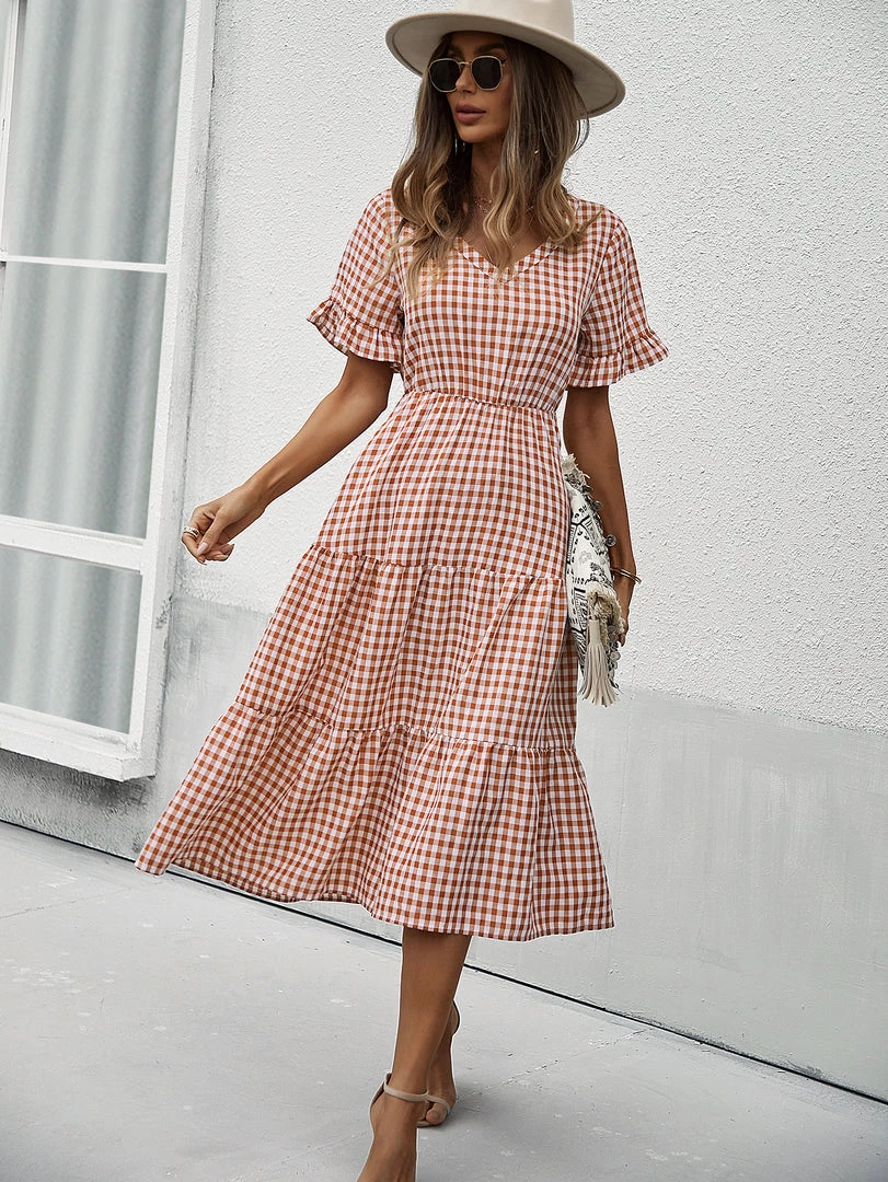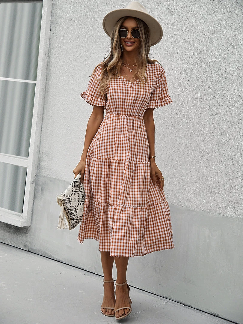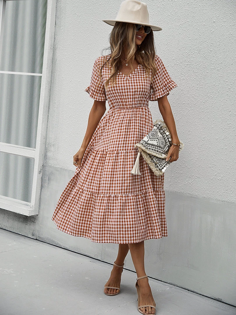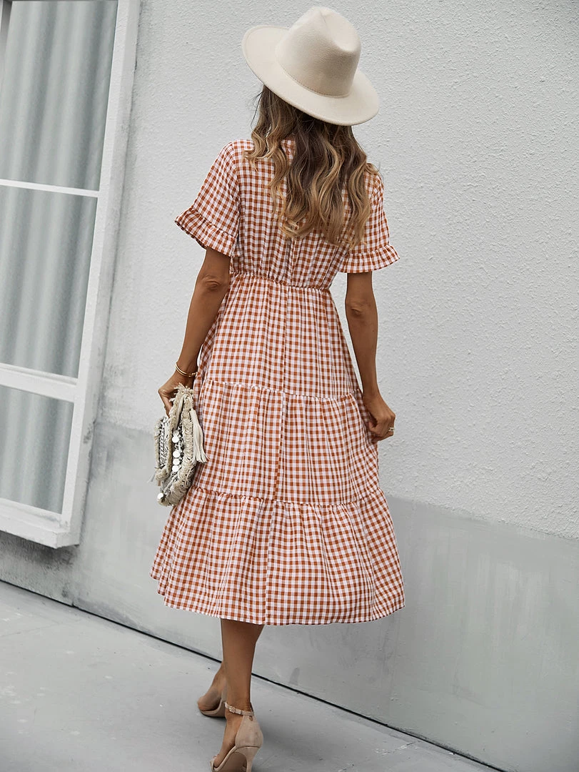 - Feature: Midi length. V neckline. Short sleeve. Tiered skirt.