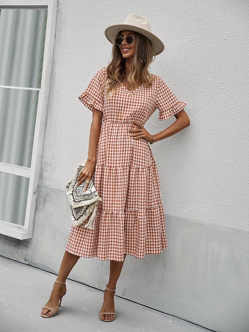 Our Shasta Dress comes in a soft blush gingham print. This dress features short sleeves, and a tiered skirt, v neckline. The relaxed fit mid pairs beautifully with our heels or sandals for a fun casual look!