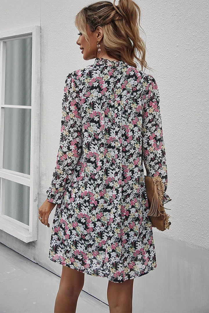 Our Terrence Dress comes in a black tone featuring a pink and yellow floral print. This relaxed mini features a gathered high neckline! This flowy midi pairs beautifully with our heels or sandals for a fun casual look!