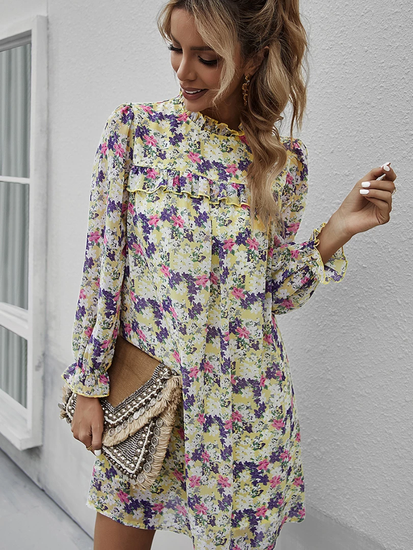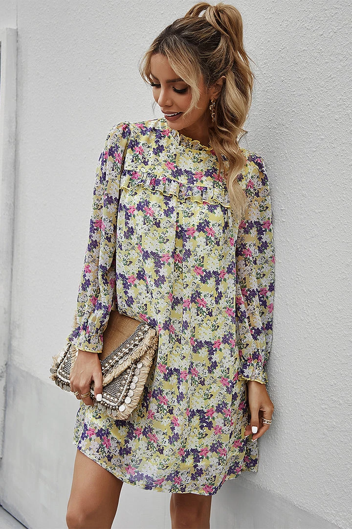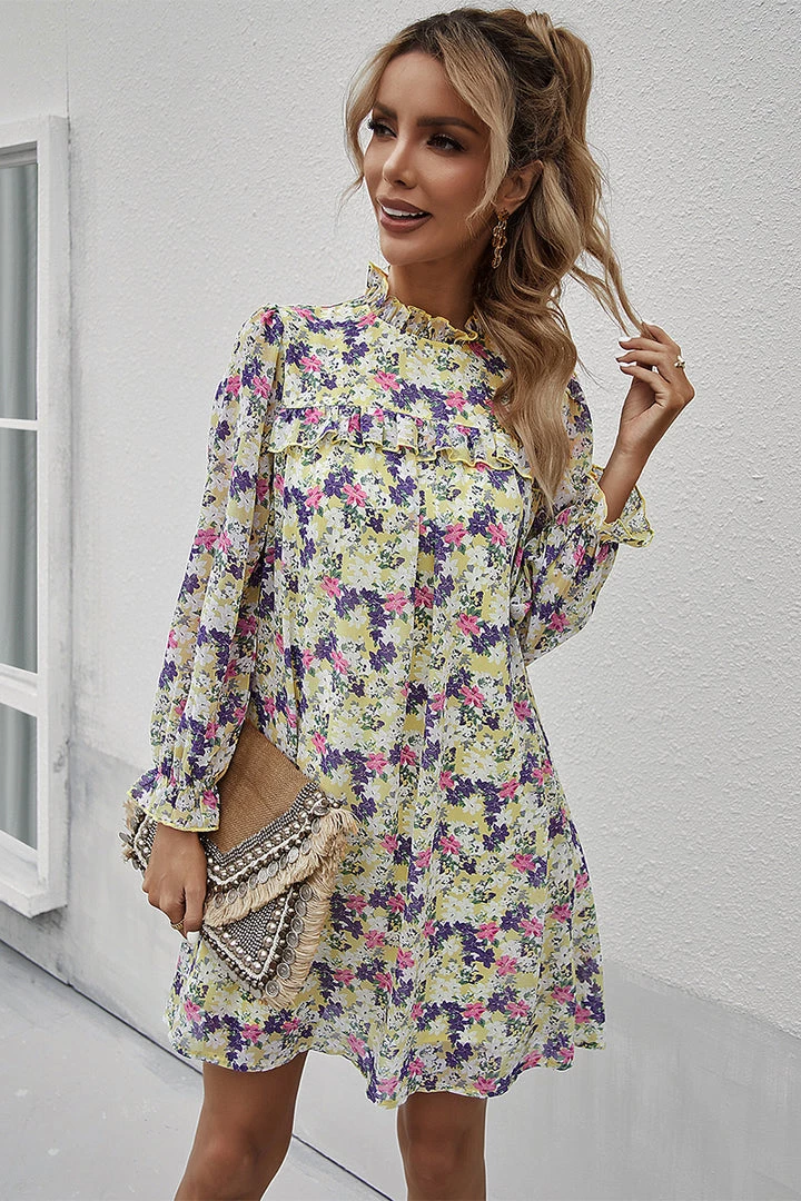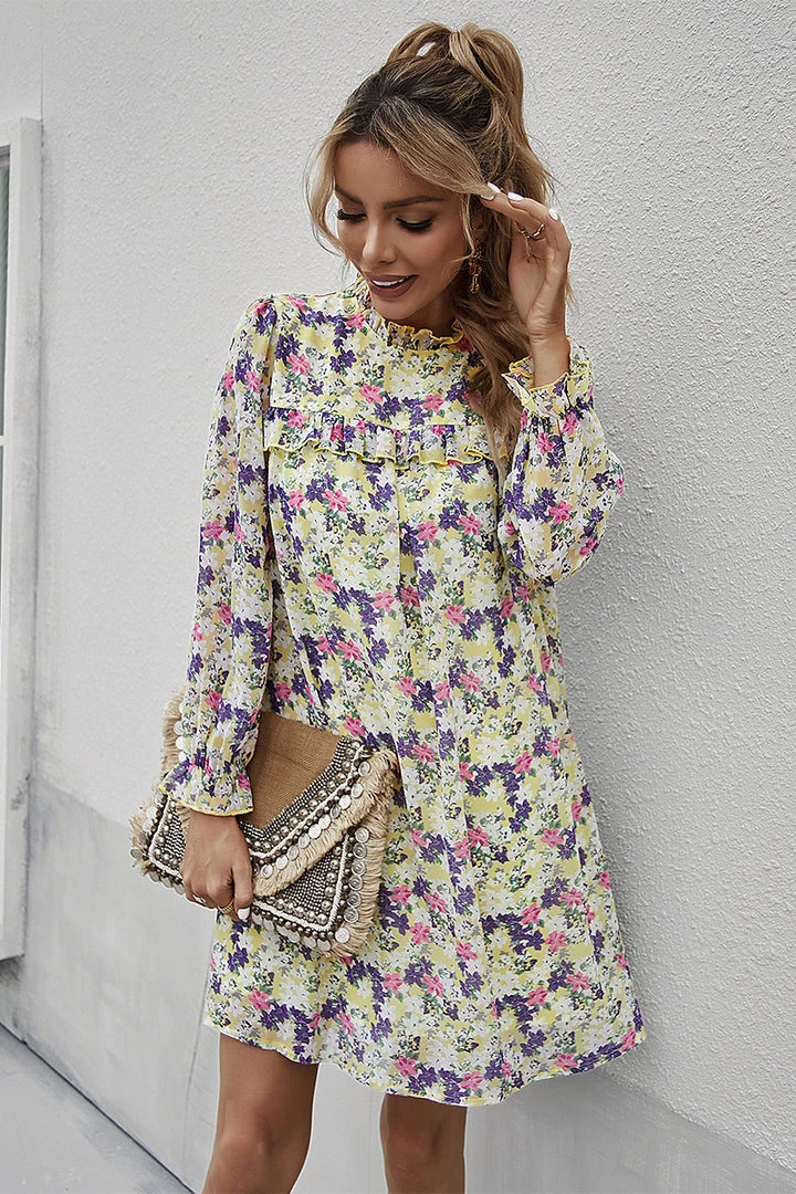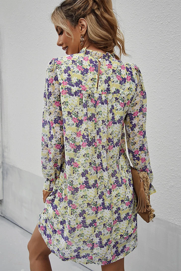 Our Terrence Dress comes in a blue tone featuring a pink and yellow floral print. This relaxed mini features a gathered high neckline! This flowy midi pairs beautifully with our heels or sandals for a fun casual look!