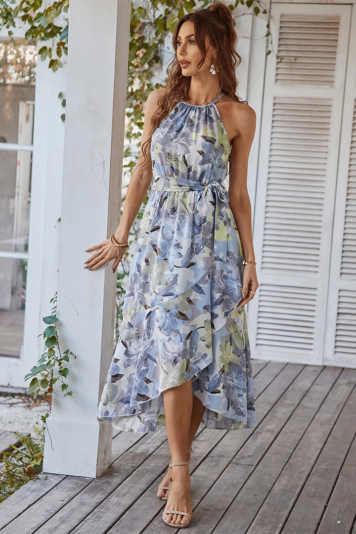 Our Tobi Dress is a gorgeous halter neck style maxi that comes in a vibrant lily and white prints. The frill hemline & fabric waist tie cinches the figure beautifully & is a lovely feminine addition to the wardrobe.