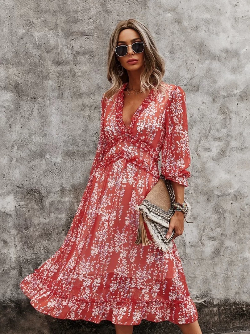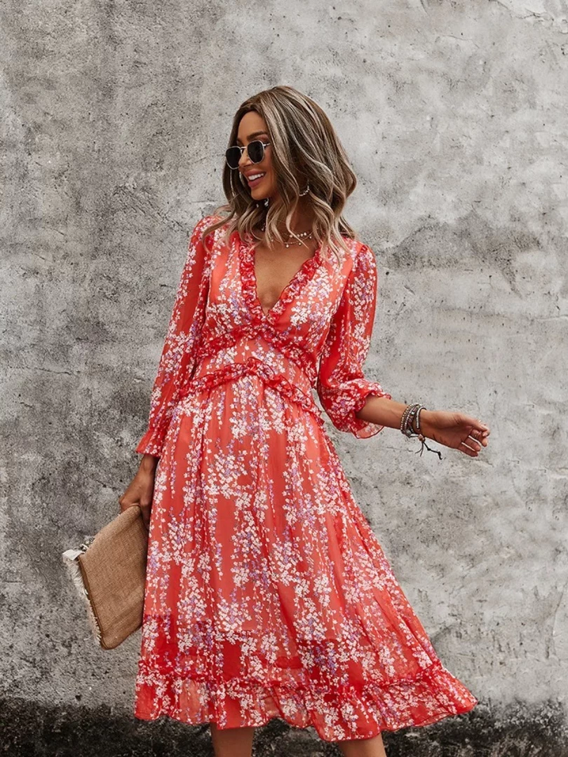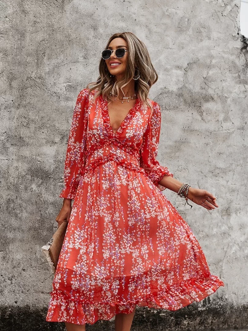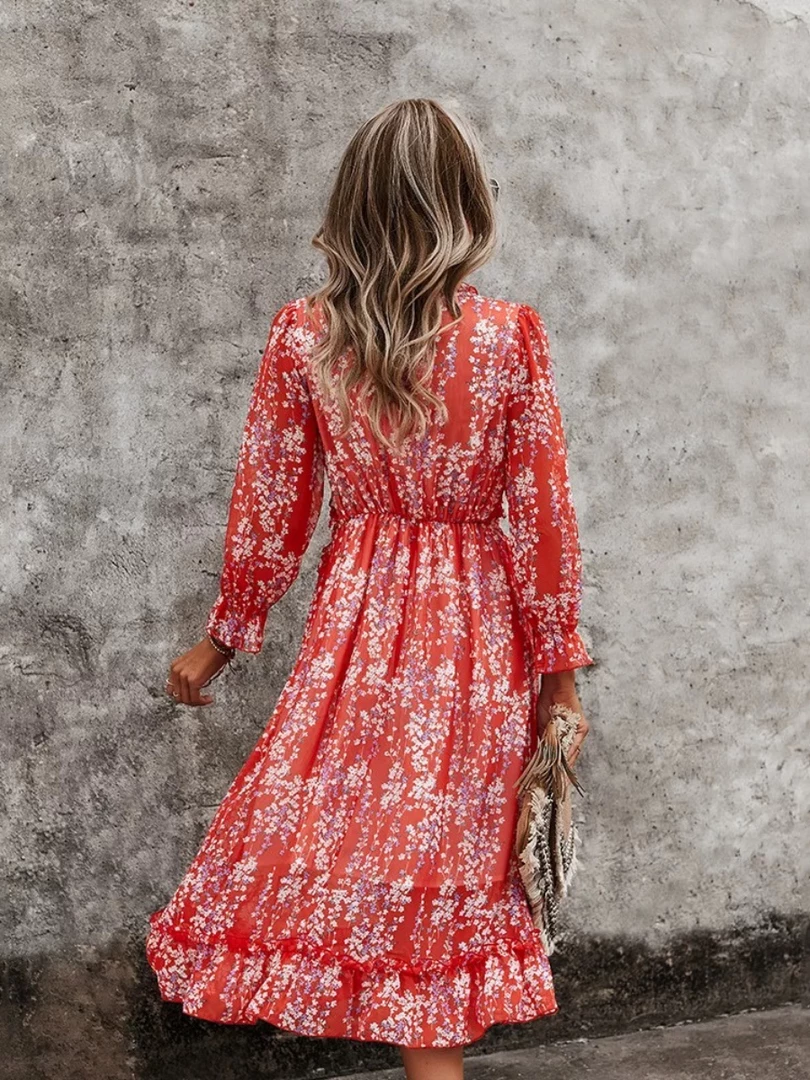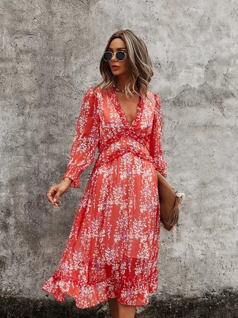 - Feature: V-shaped neckline. Long sleeves. Fitted at shoulder to waist. Midi length. Shirred waist. Tie details on the bust. Frill details on the hem of the skirt.