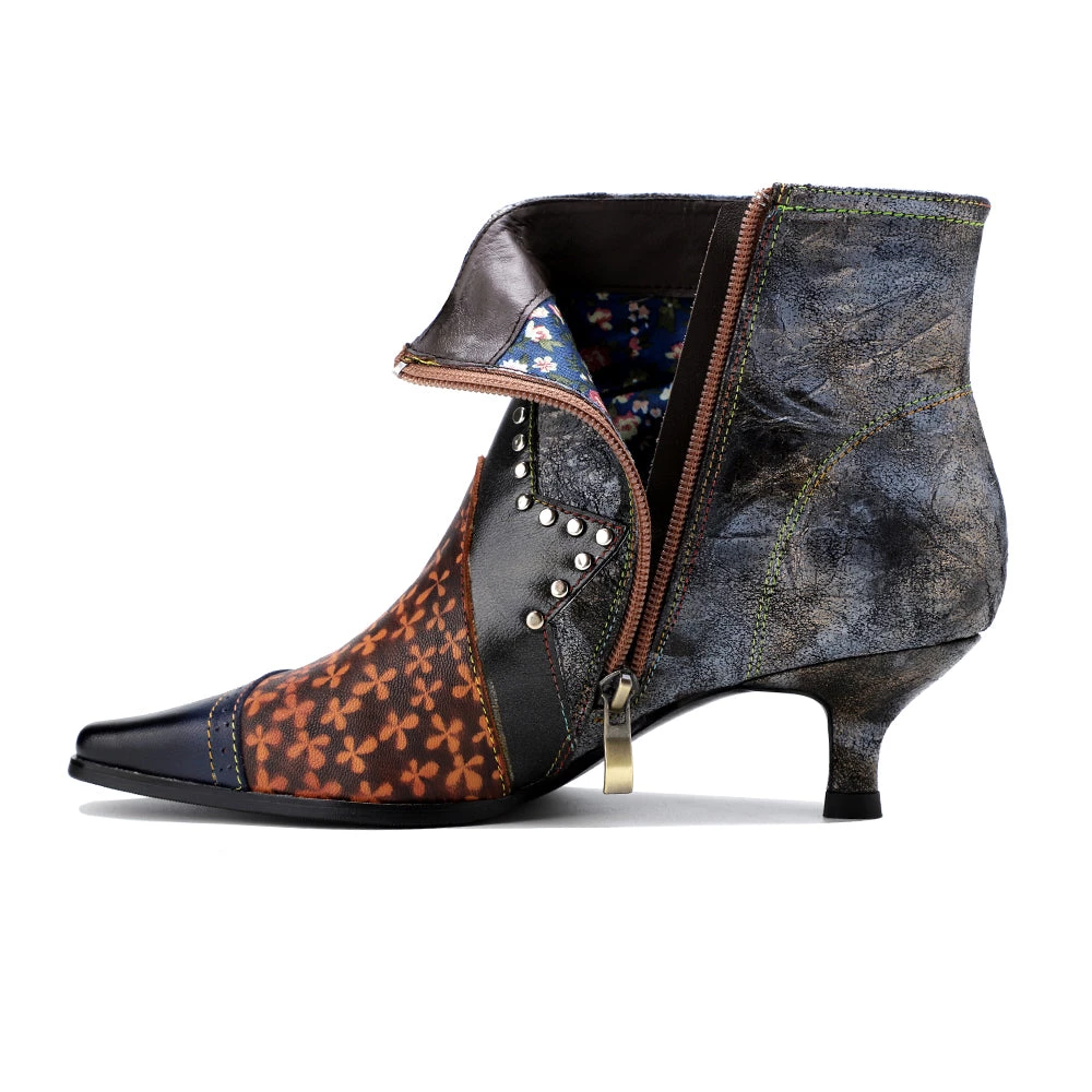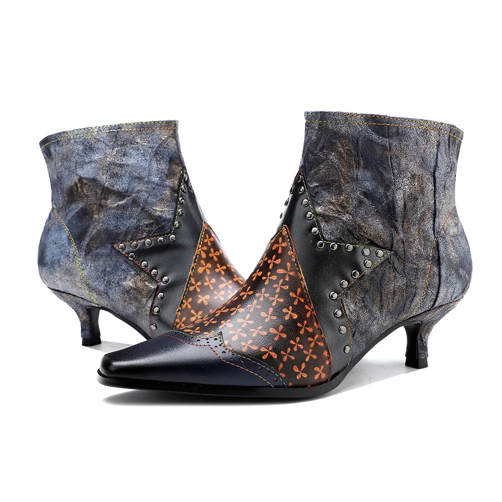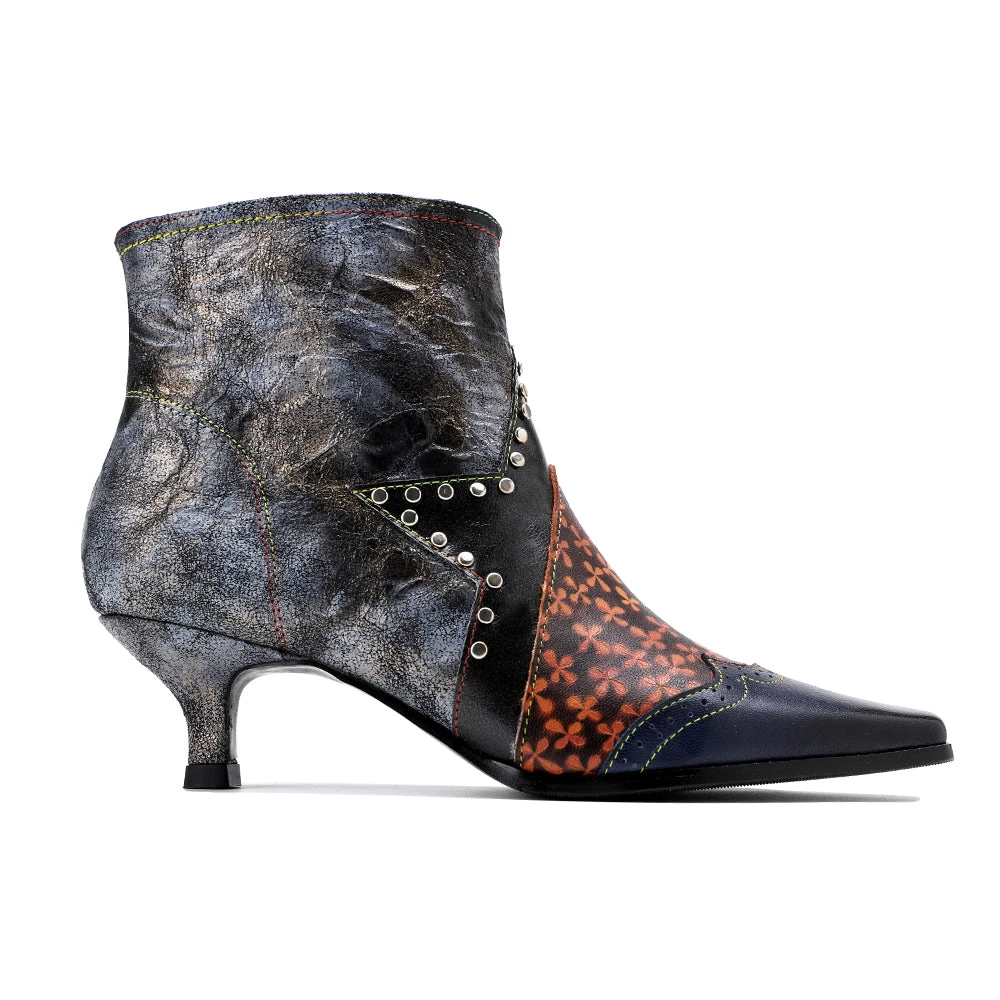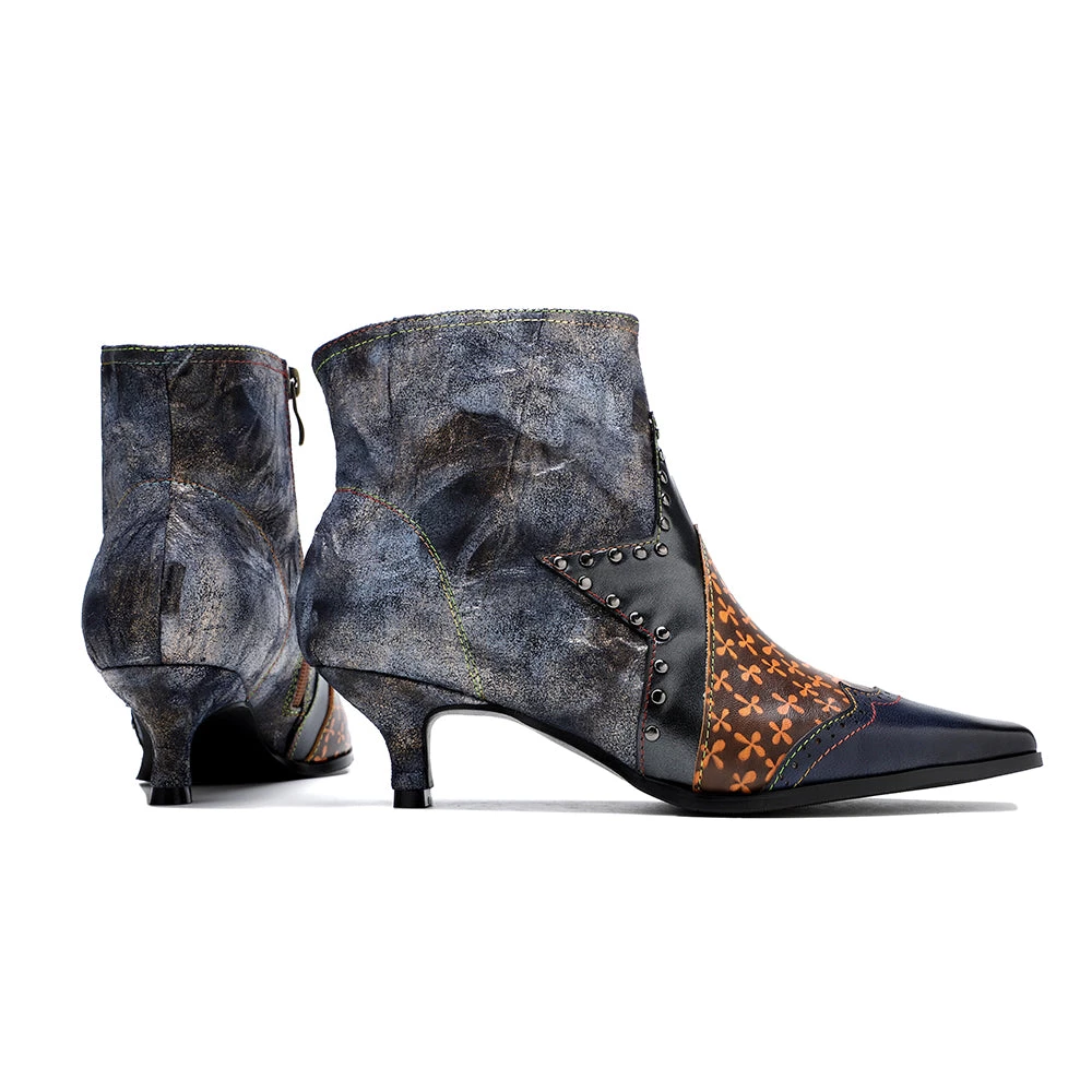 Give your footwear storage a stylish distress style boost with this slightly-lifted bootie showing off a deep hue and stud deco.