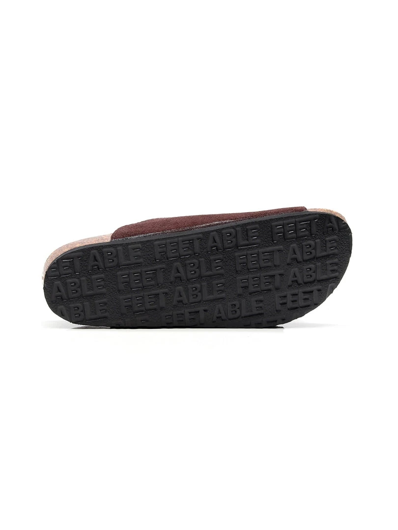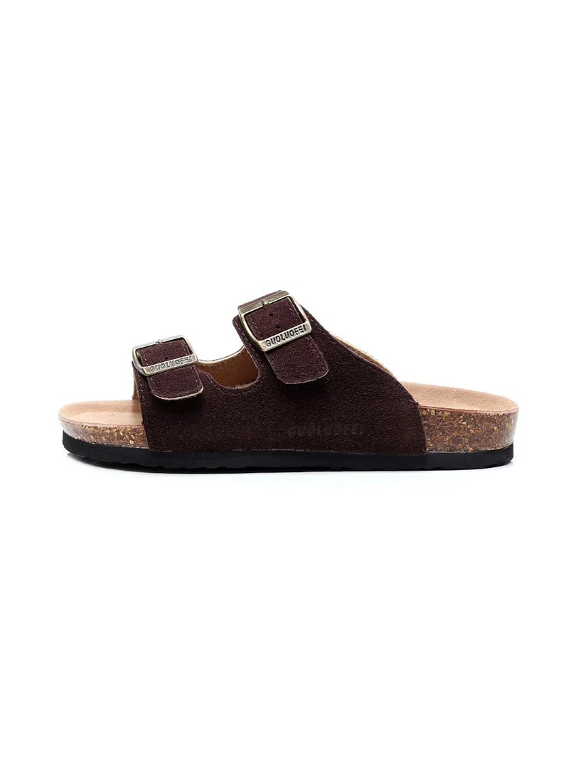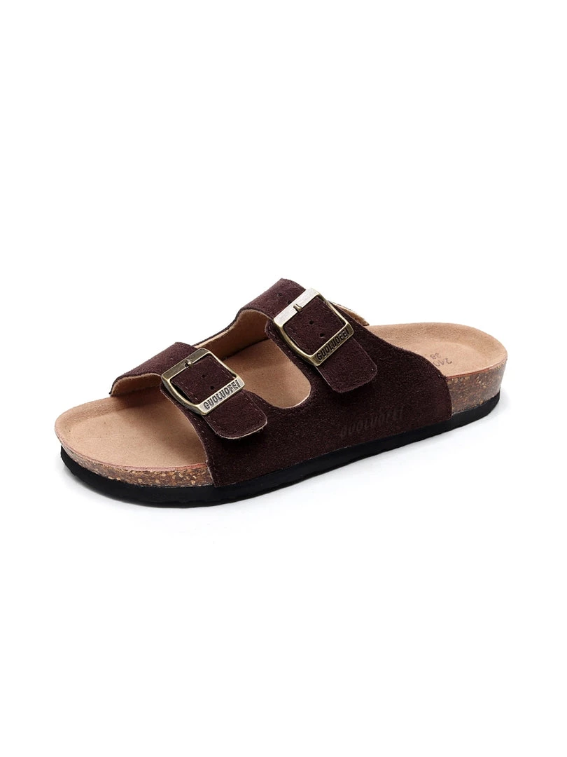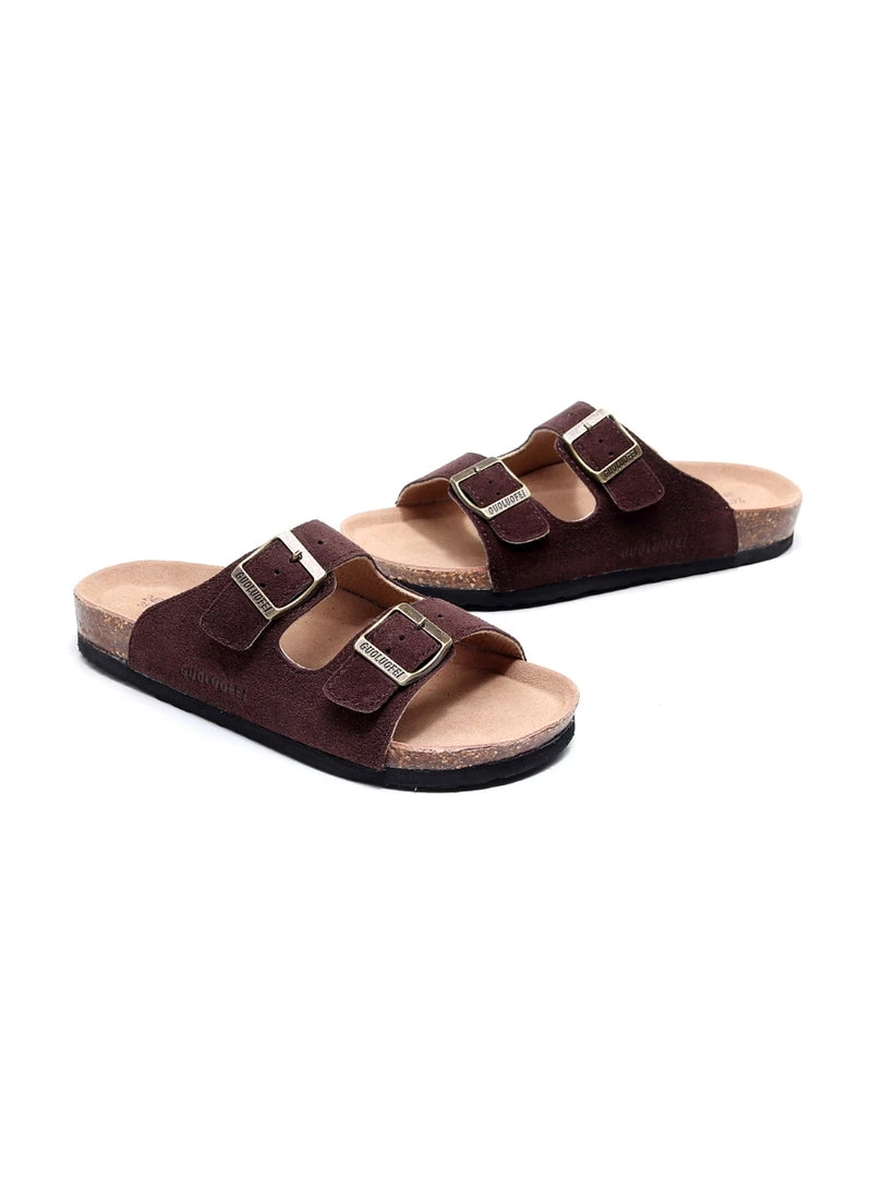 A double strap stretches across the foot for comfortable, secure steps in this pair of durable slide-on sandals crafted with high-quality materials for years of wear.
