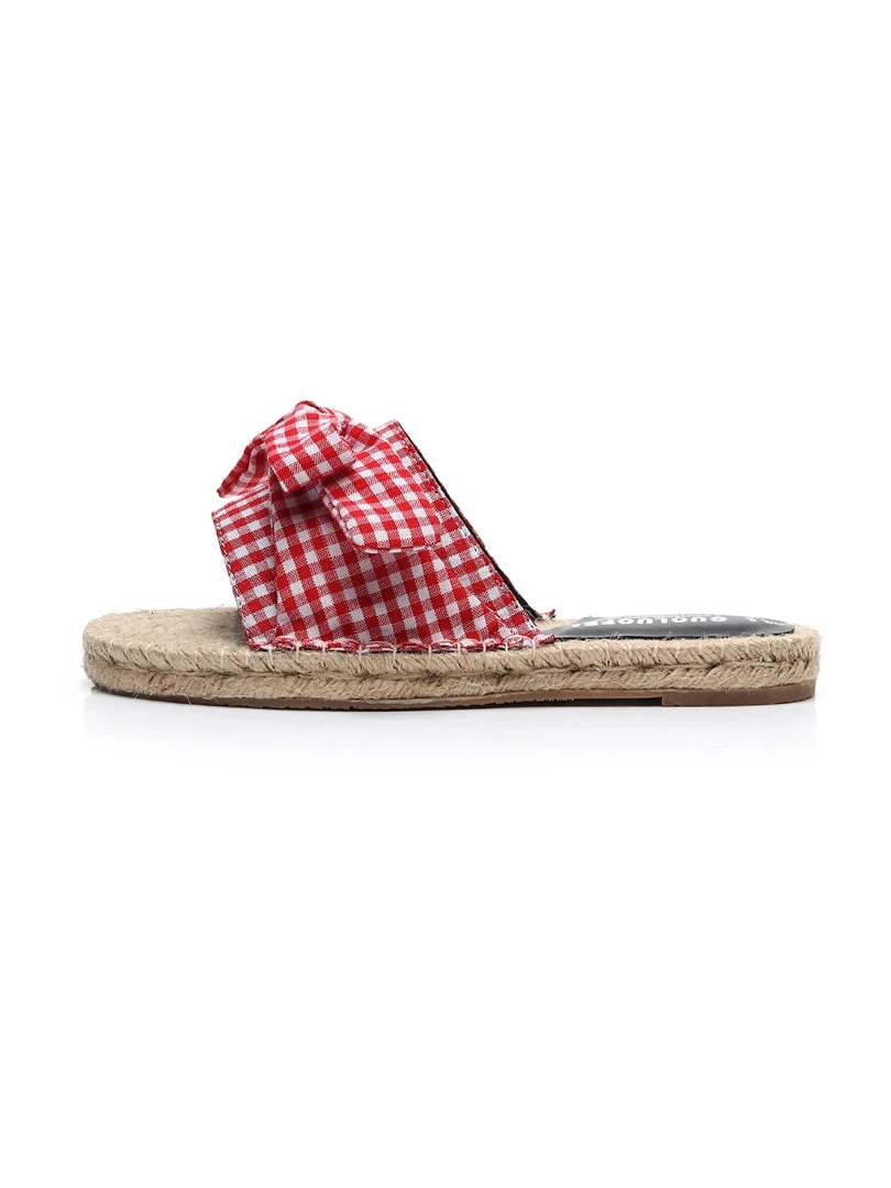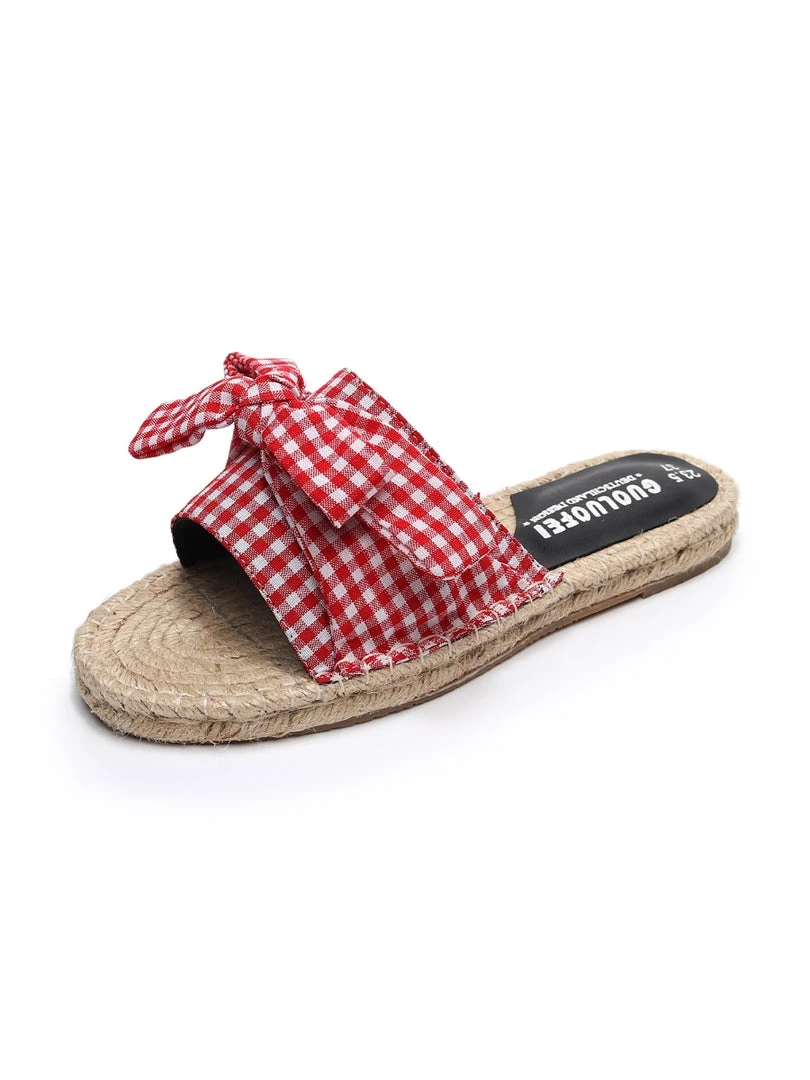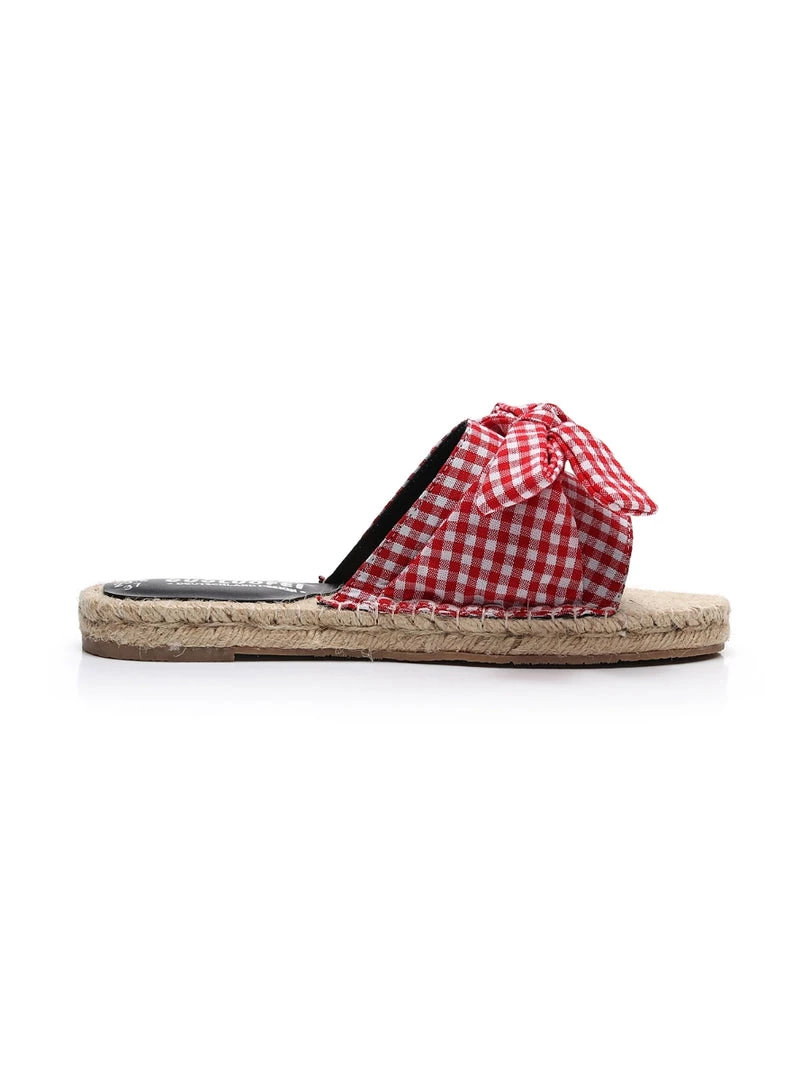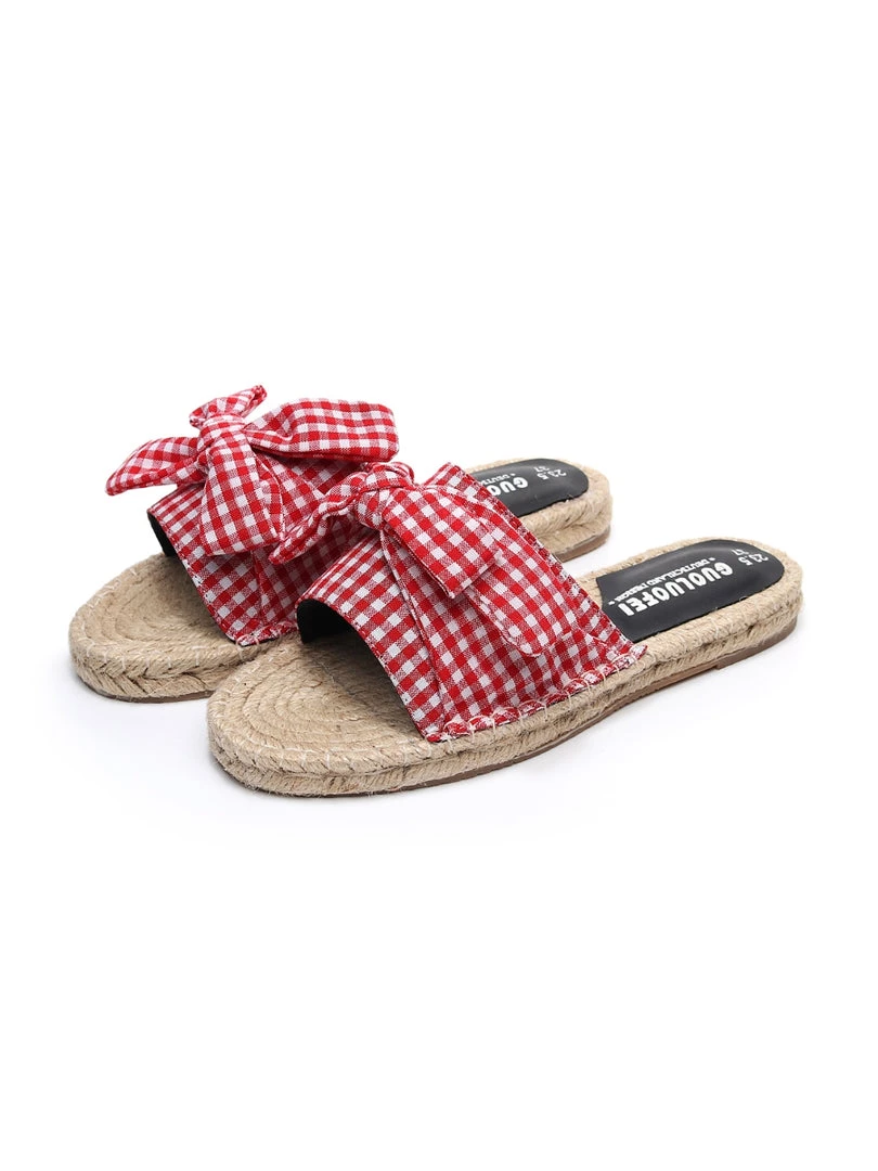 Gingham textile adds casual charm and a pop of print to your look in this pair of effortless slides designed with a comfortable and breathable natural straw mat insole.