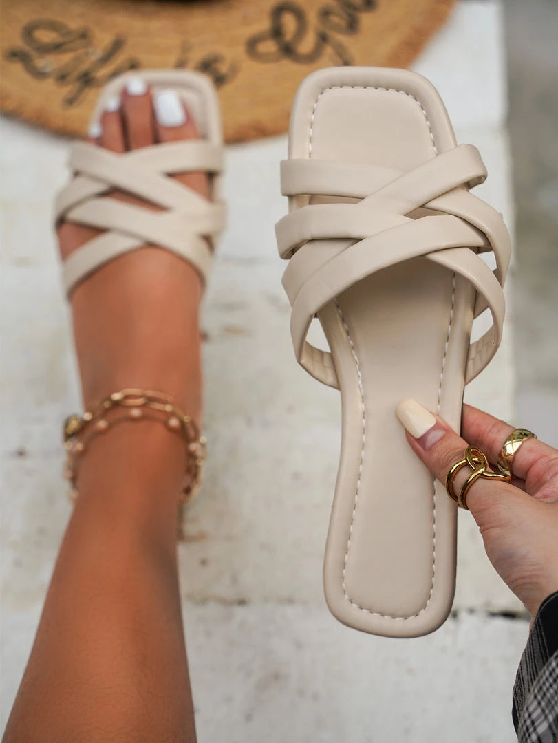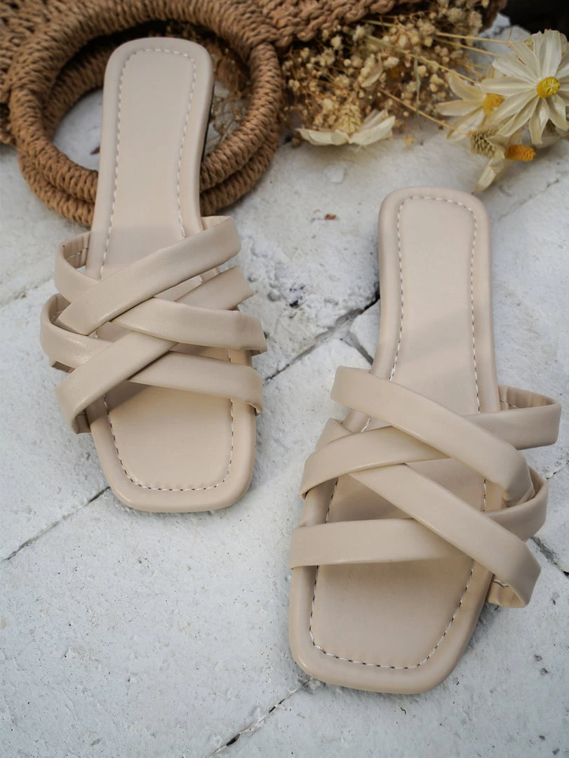 Put your fashionable foot forward in this easy-on slides featuring a double criss cross straps for stylishly warm-weather wear.