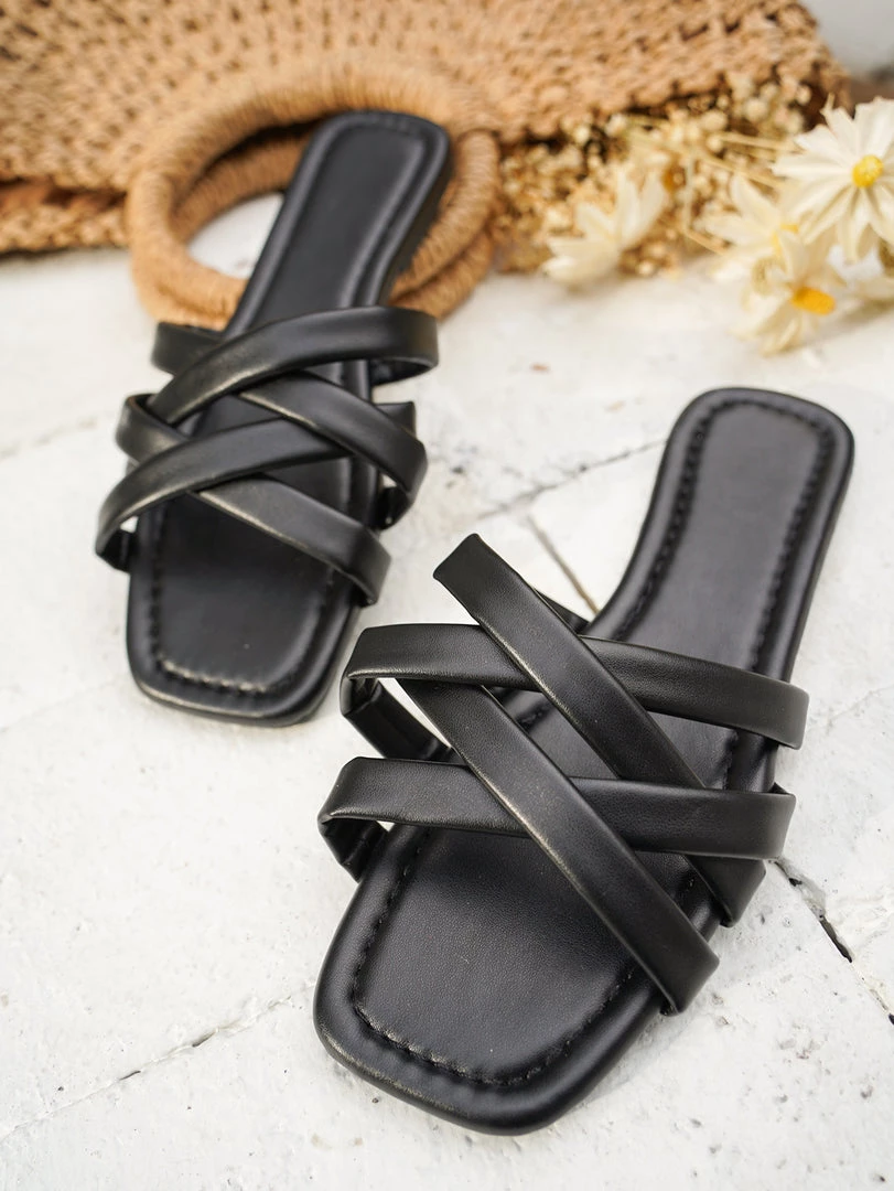 Put your fashionable foot forward in this easy-on slides featuring a double criss cross straps for stylishly warm-weather wear.
