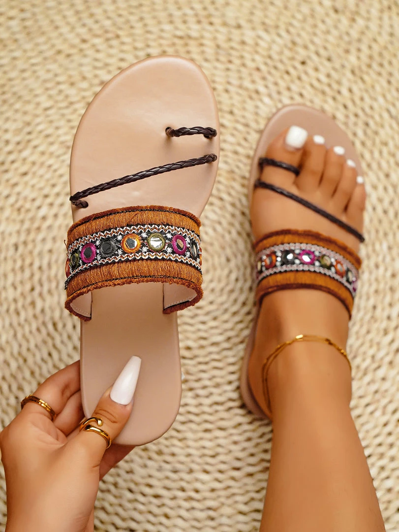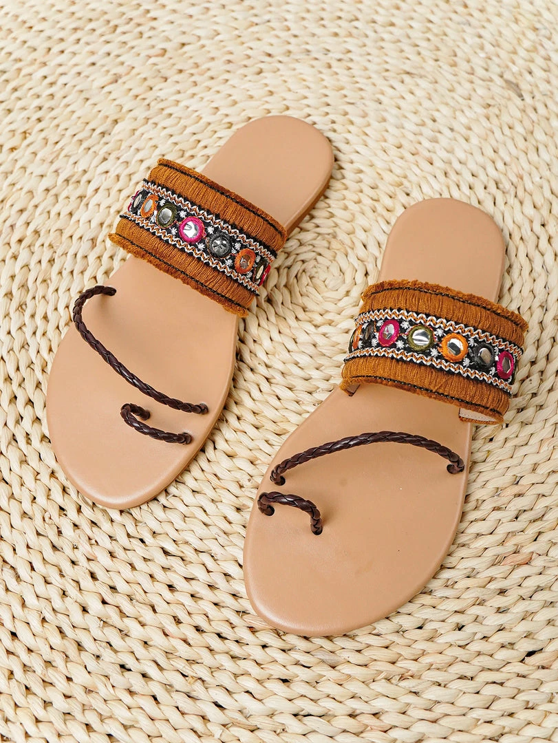 Our boho string thong comes in a brown tone. Upper colorful embroidered details strap staple for your work or off-duty style.