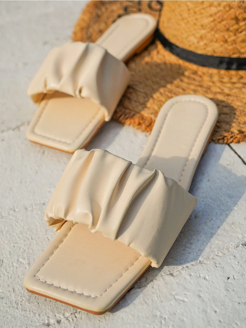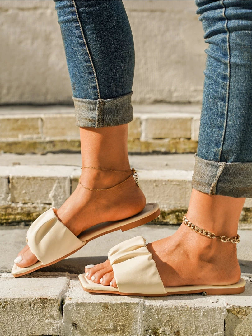 Put your fashionable foot forward in this easy-on sandal featuring a folder detail upper and flat heel for stylishly warm-weather wear.