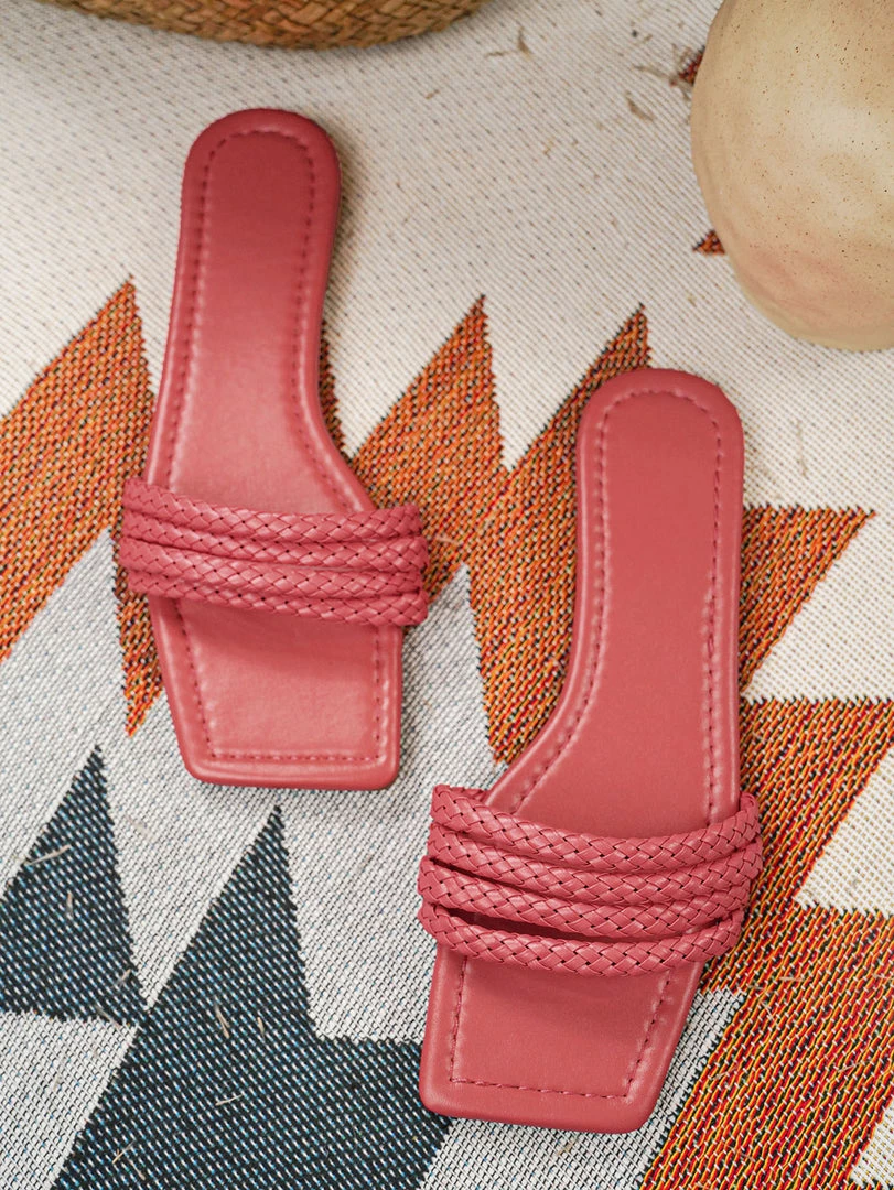 Put your fashionable foot forward in this easy-on slides featuring a woven tri-strap and flat heel for stylishly warm-weather wear.