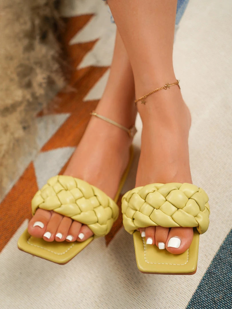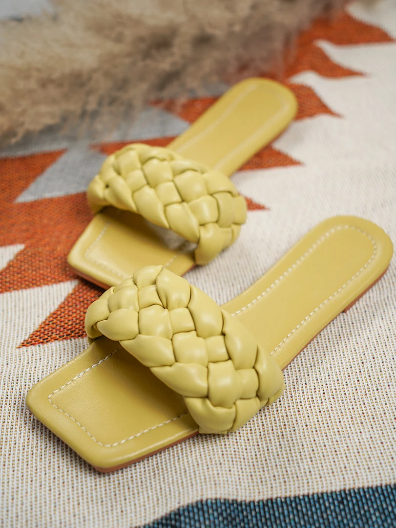 Put your fashionable foot forward in this easy-on slides featuring a woven strap and flat heel for stylishly warm-weather wear.