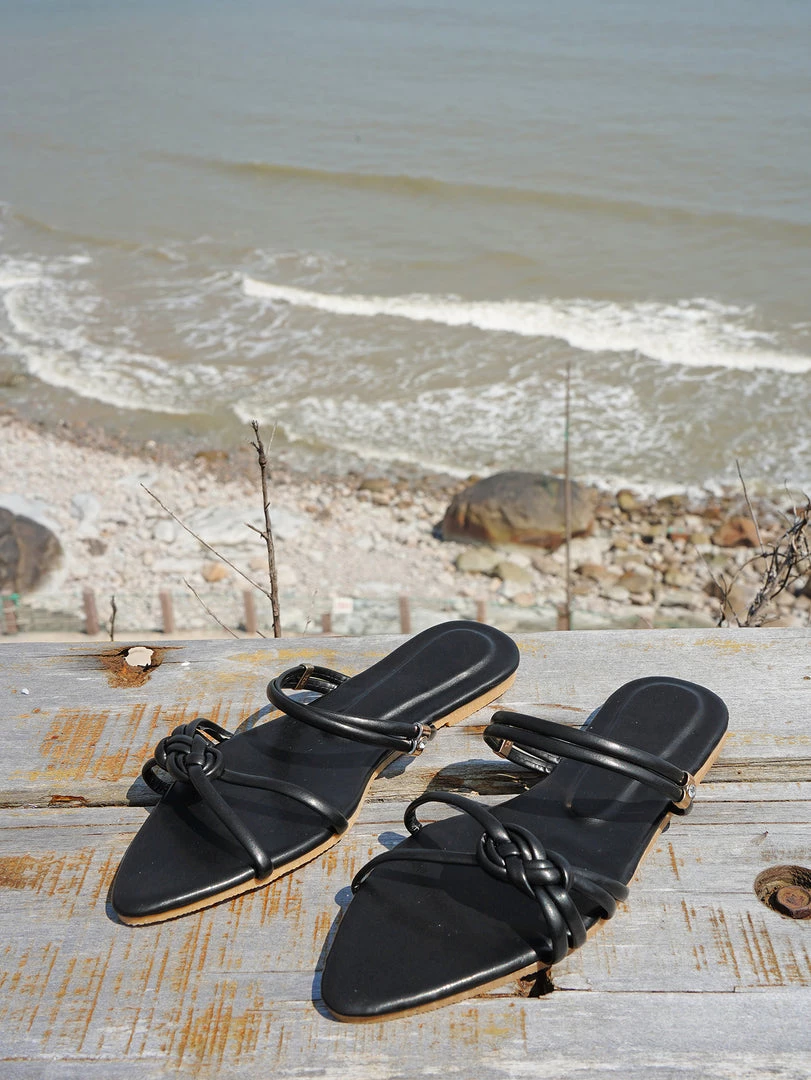 Featuring double kiss ties design and a cross straps detail, these slides are a must-have for your chic warm-weather wardrobe.