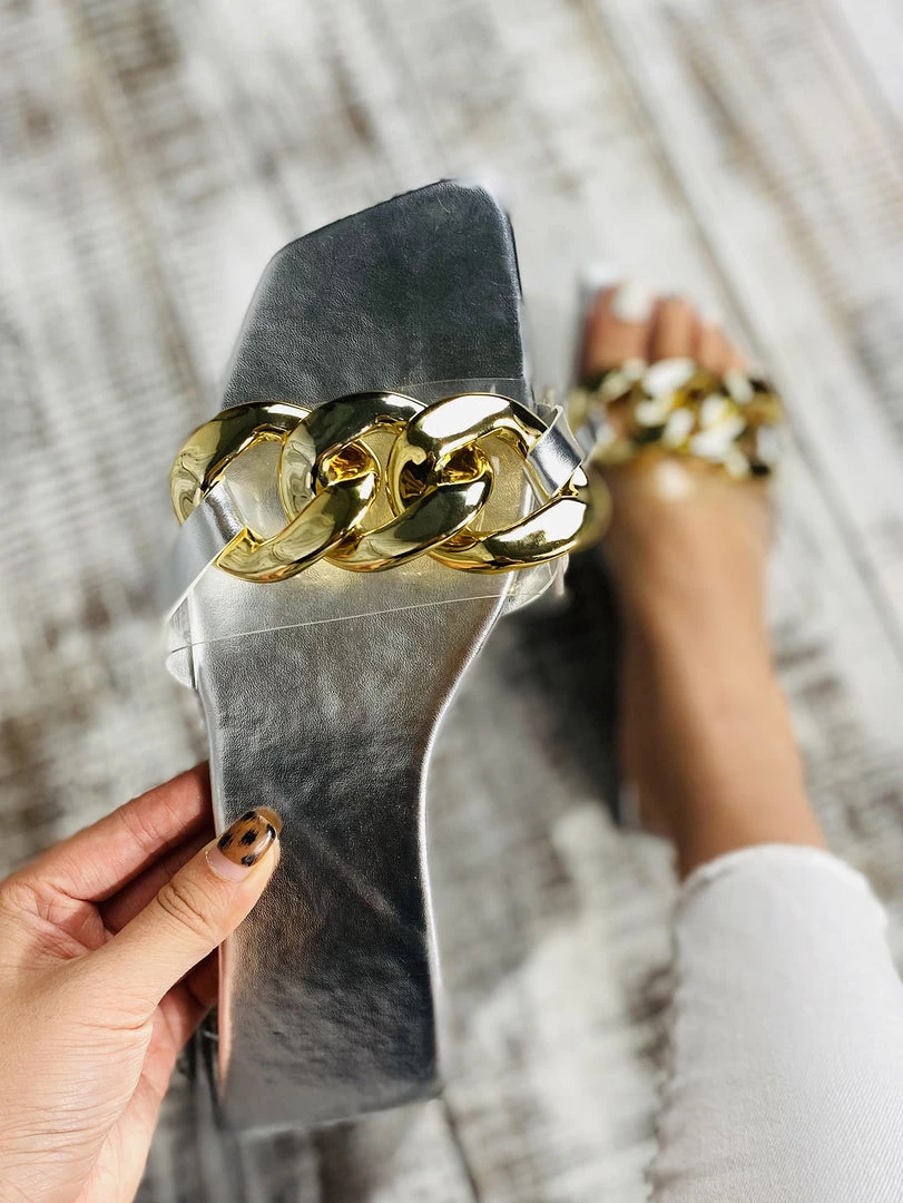 Elevate your sunny-day ensemble with these slip-on sandals crafted with a trendy chain accent and durable rubber soles.