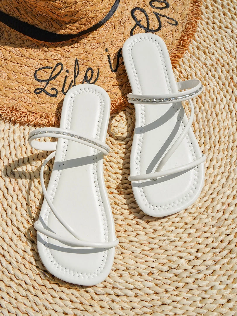 Add sparkle to your steps with these slides featuring a slim strap accented by shimmering rhinestones.