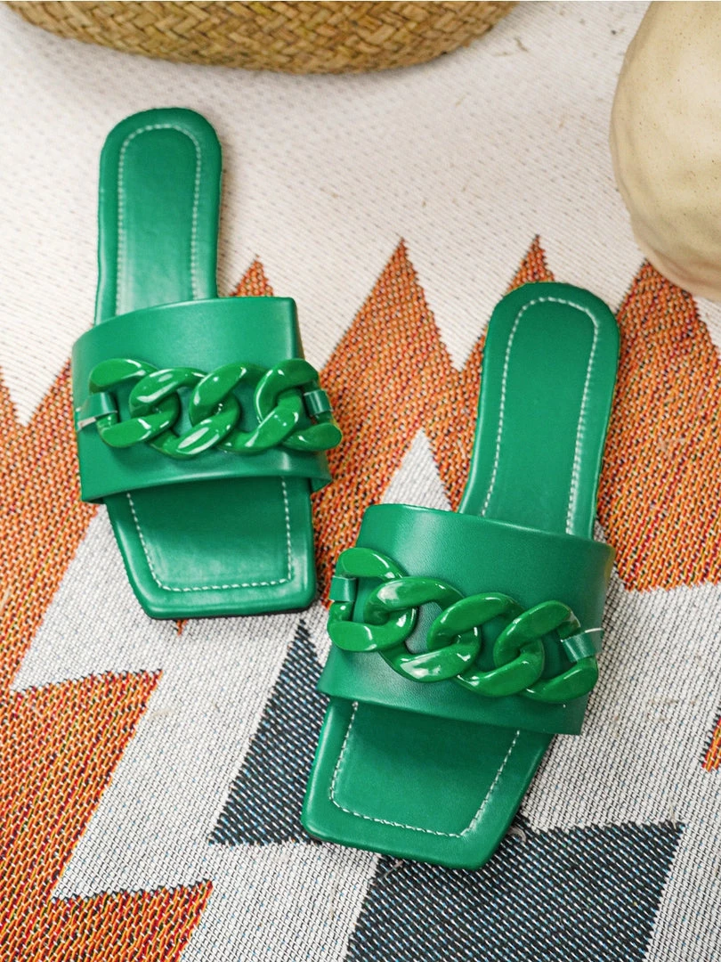Add some funky to your steps with the bold chain-strap design of this flat sandal boasting a glossy silhouette and a sturdy rubber sole. Also available in black & beige.