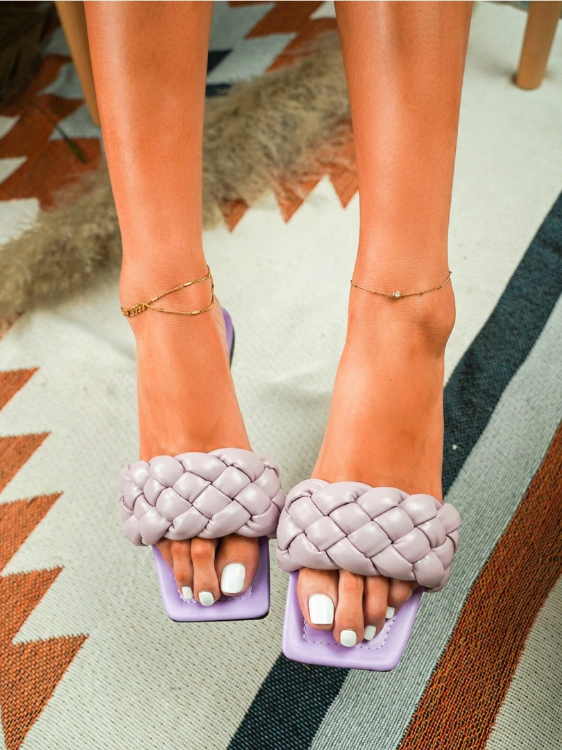 Put your fashionable foot forward in this easy-on sandal featuring a woven strap and flat heel for stylishly warm-weather wear.