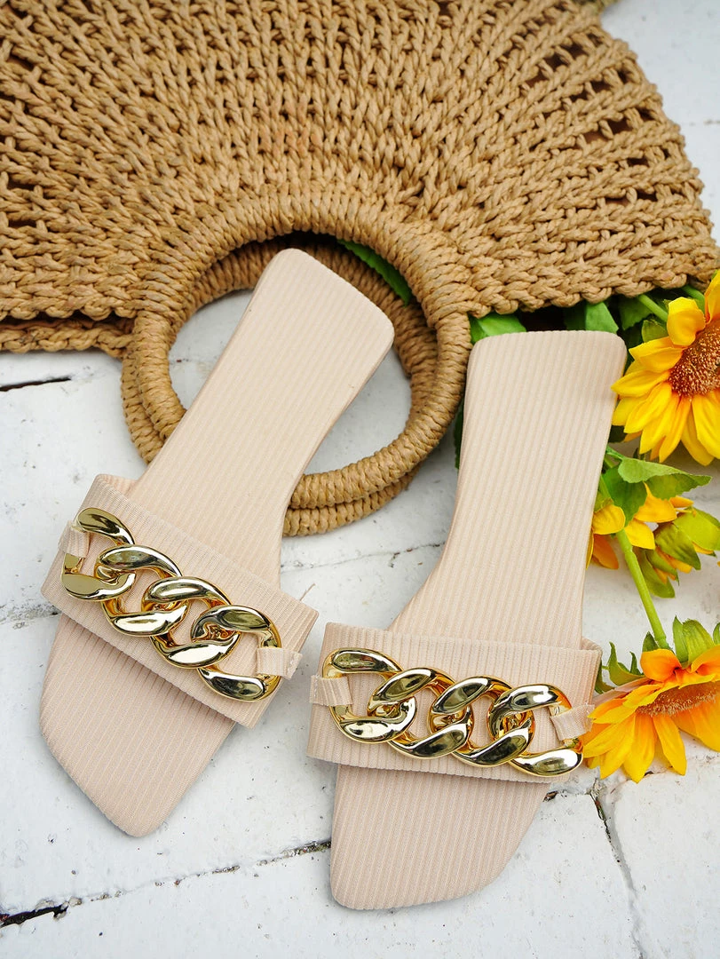 Our Howardina slide by En Bloom come in a soft ivory color features a mega golden chain upper. They are a go-to for effortless all day style!