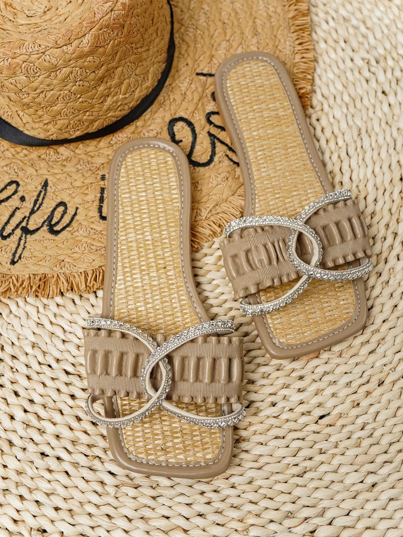 Add sparkle to your steps with these slides featuring a thick braided strap accented by shimmering rhinestones.